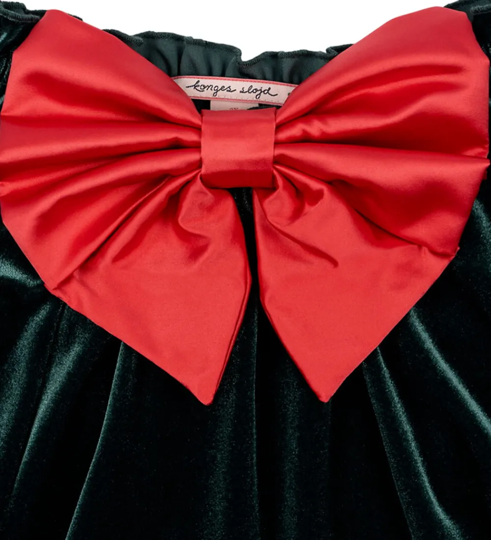 Flot nederdel fra Konges Sløjd i dyb mørkegrøn velour, og fortil sidder der en stor, koralfarvet sløjfe af satin. Konges Sløjd nederdelen har en smal elastikkant i livet, og nederdelen har masser af vidde.