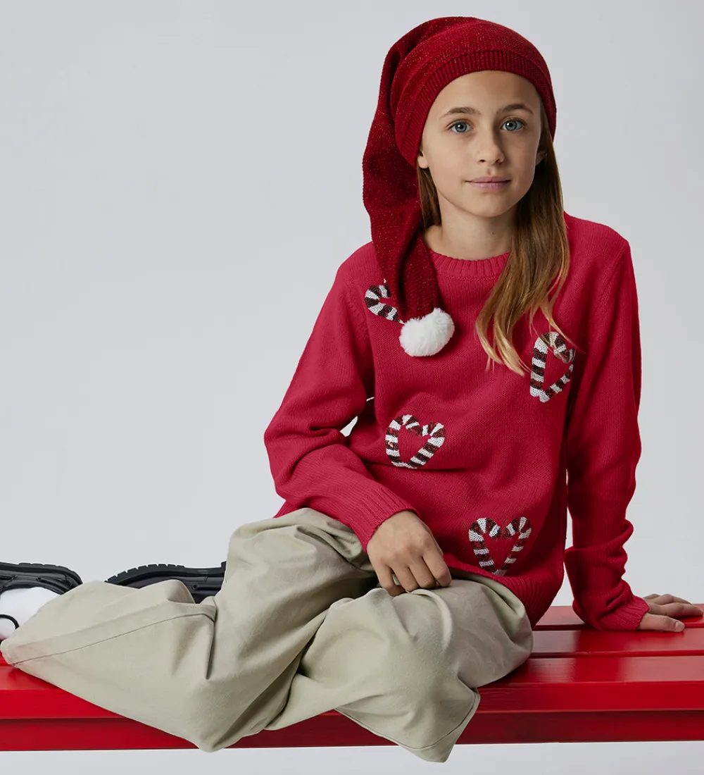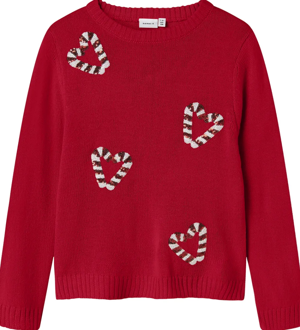 Festlig Name It bluse i rød med palietter i rød og hvid som danner slikstokke-hjerter. Blusen har en strikket struktur med lange ærmer og ribkanter.