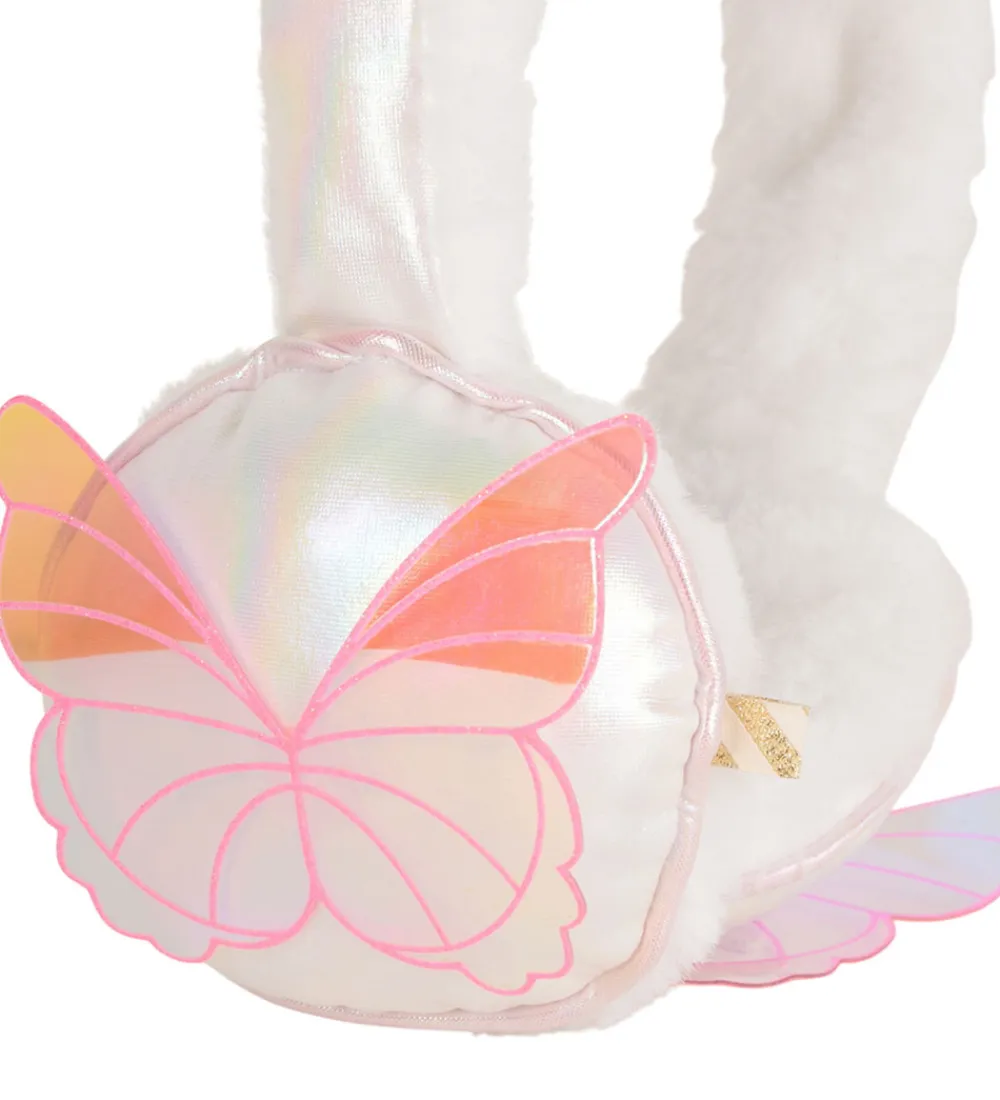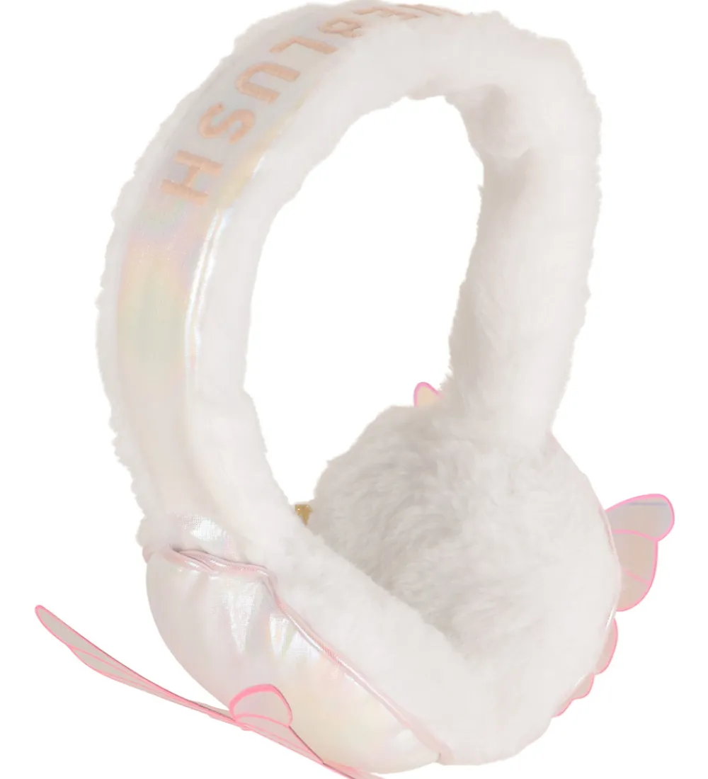 Sød Billieblush ørevarmere i hvidt, imiteret pels med sommerfugle på ørene samt et broderet logo på bøljen.
