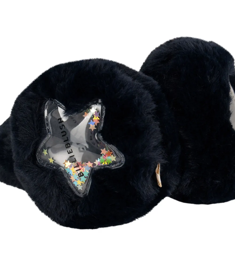 Flotte Billieblush ørevarmere i en dyb navy farve. Ørevarmerne har en blød, plysset tekstur, der dækker både bøjle og ørestykker. En smuk stjerne og et sødt hjerte med små multifarvede stjerner indeni pynter på ørestykkerne, hvilket tilføjer et stilfuldt touch. Ørevarmerne kombinerer funktionalitet og elegance, som kendetegner Billieblush.