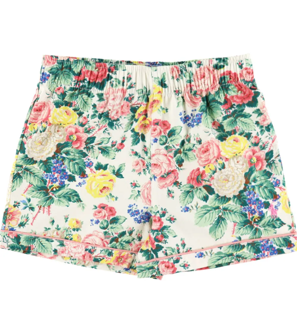 Sødt Polo Ralph Lauren nattøj, der består af et par natbukser og en natbluse i hvid med et blomstret mønster i rosa, lilla, gul og hvid og med blade i grønne nuancer. Nattøjet har rosa pipings, og det er lavet i en fastvævet kvalitet.
