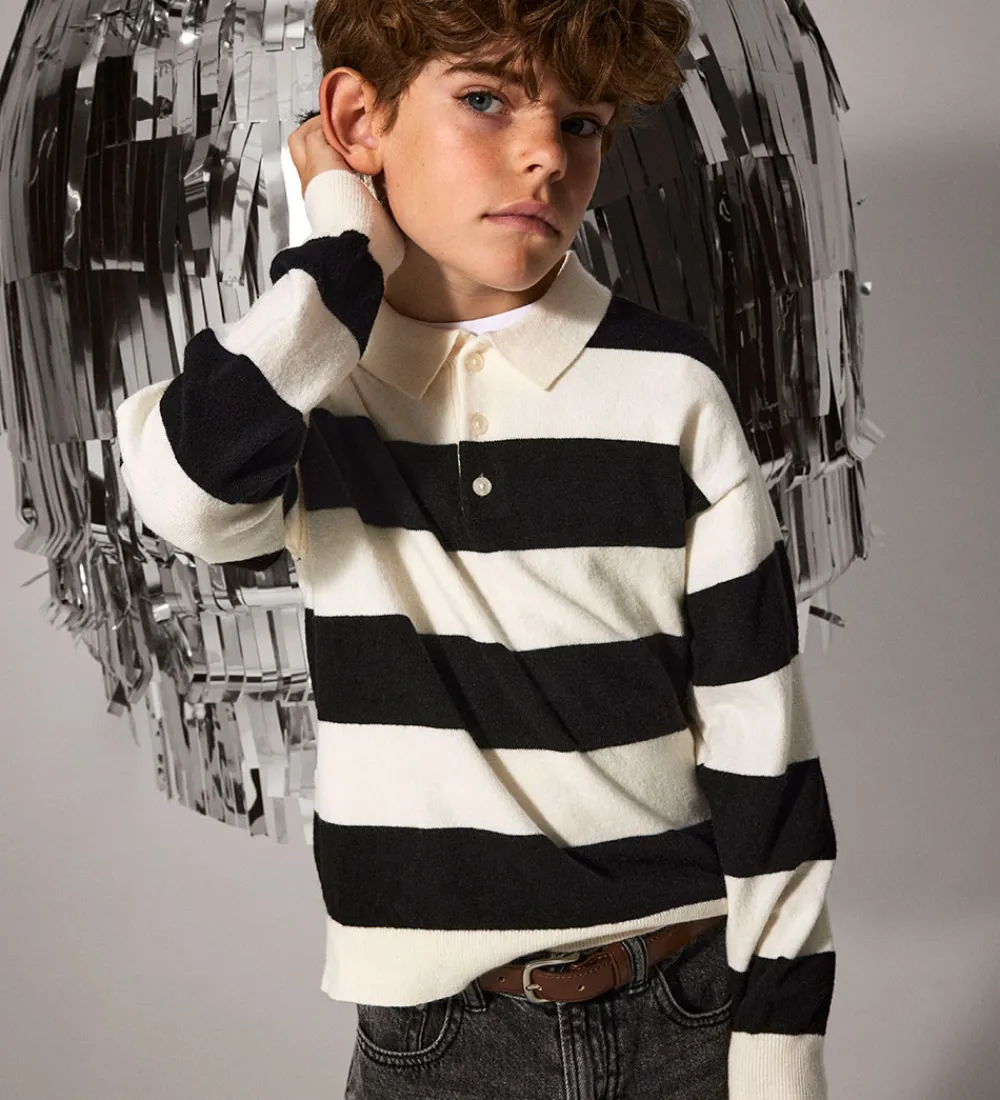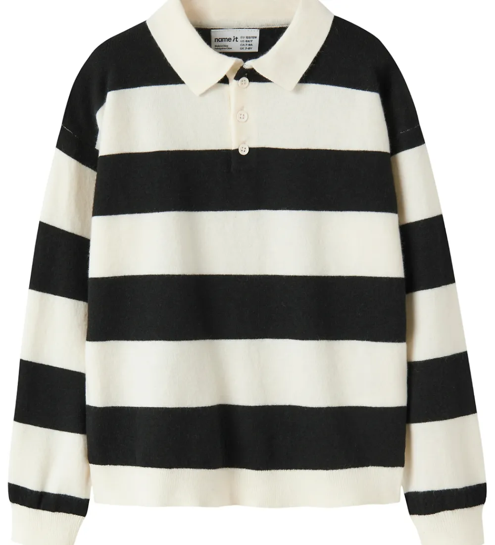 Smart Name It polo med brede, vandrette striber i sort og hvid. Poloen har lange ærmer og en fin strikket struktur. Der er en klassisk krave med tre knapper i halsudskæringen, som giver mulighed for justering.