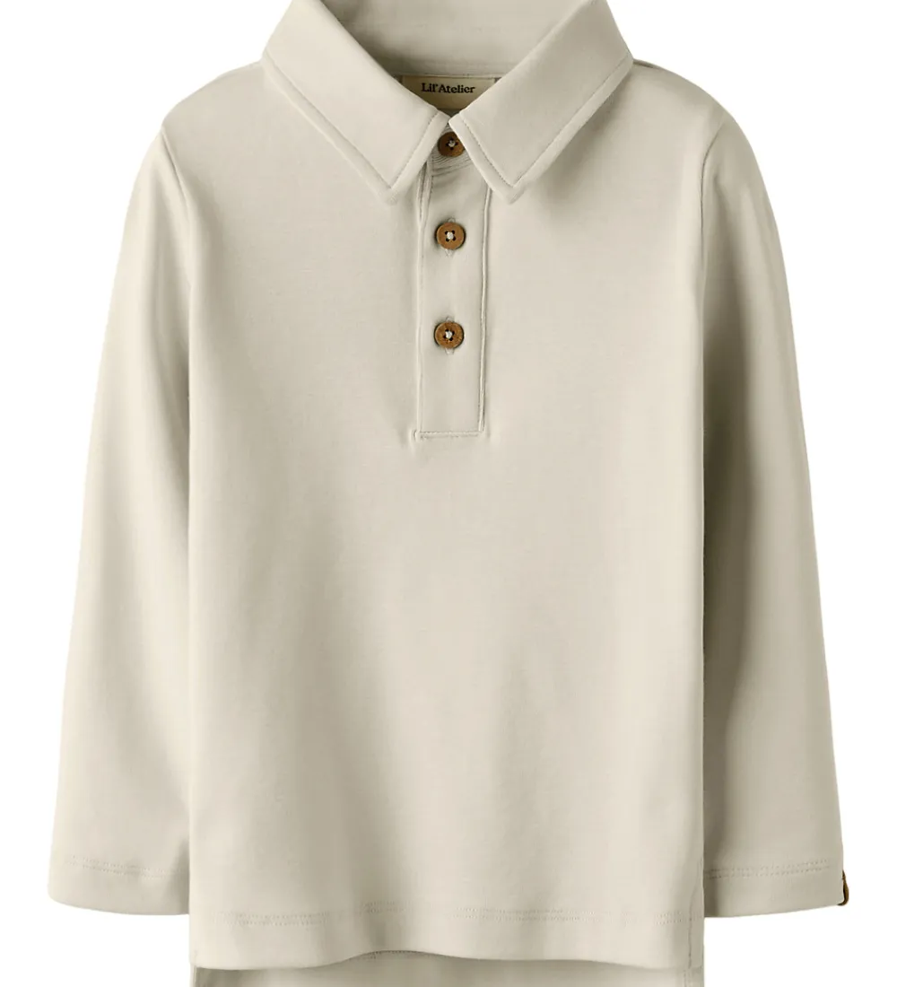 Poloblusen har lange ærmer og en klassisk krave, der tilføjer et stilrent udtryk. Knappestolpen med tre knapper i trælook giver en tidløs detalje. Den rene farve og det enkle design gør Lil Atelier blusen anvendelig til mange lejligheder.