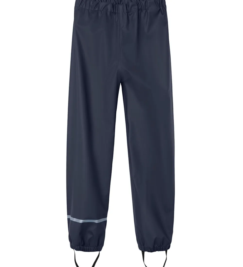 Name It regnbukserne har en indvendigt justerbar elastikkant i livet. Buksebenene har en elastikkant i bunden samt justerbare og aftagelige elastikstropper, som kan sættes under fodtøjet. Rundt om højre ærme og bukseben er der en refleks-stribe.