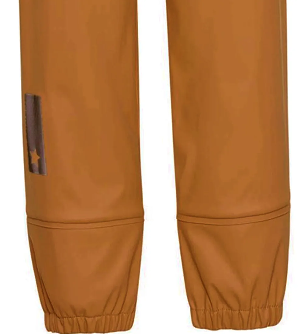 Flotte Molo regnbukser af PE i ensfarvet mandelbrun. Regnbukserne har også en praktisk logorefleks bag på højre ben.
