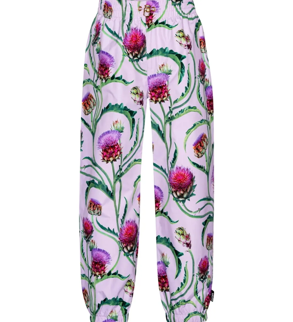 Flotte Molo regnbukser af PE i rosa med et smukt alloverprint af artiskokblomster. Regnbukserne har også en praktisk logorefleks bag på højre ben.