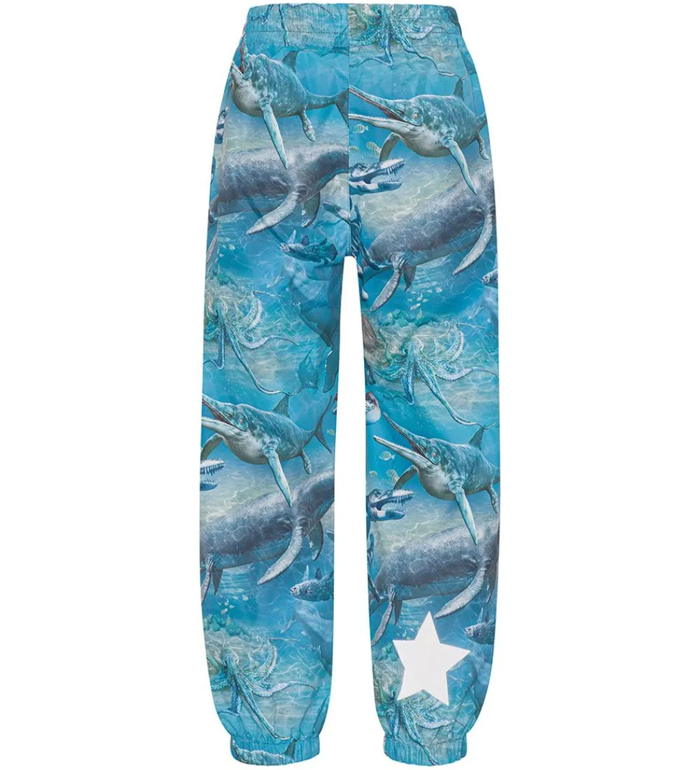 Seje Molo regnbukser i havblå med et alloverprint af skarptandede, forhistoriske havdyr. Regnbukserne er desuden udstyret med en stor, reflekterende Molo-stjerne bag på højre ben.