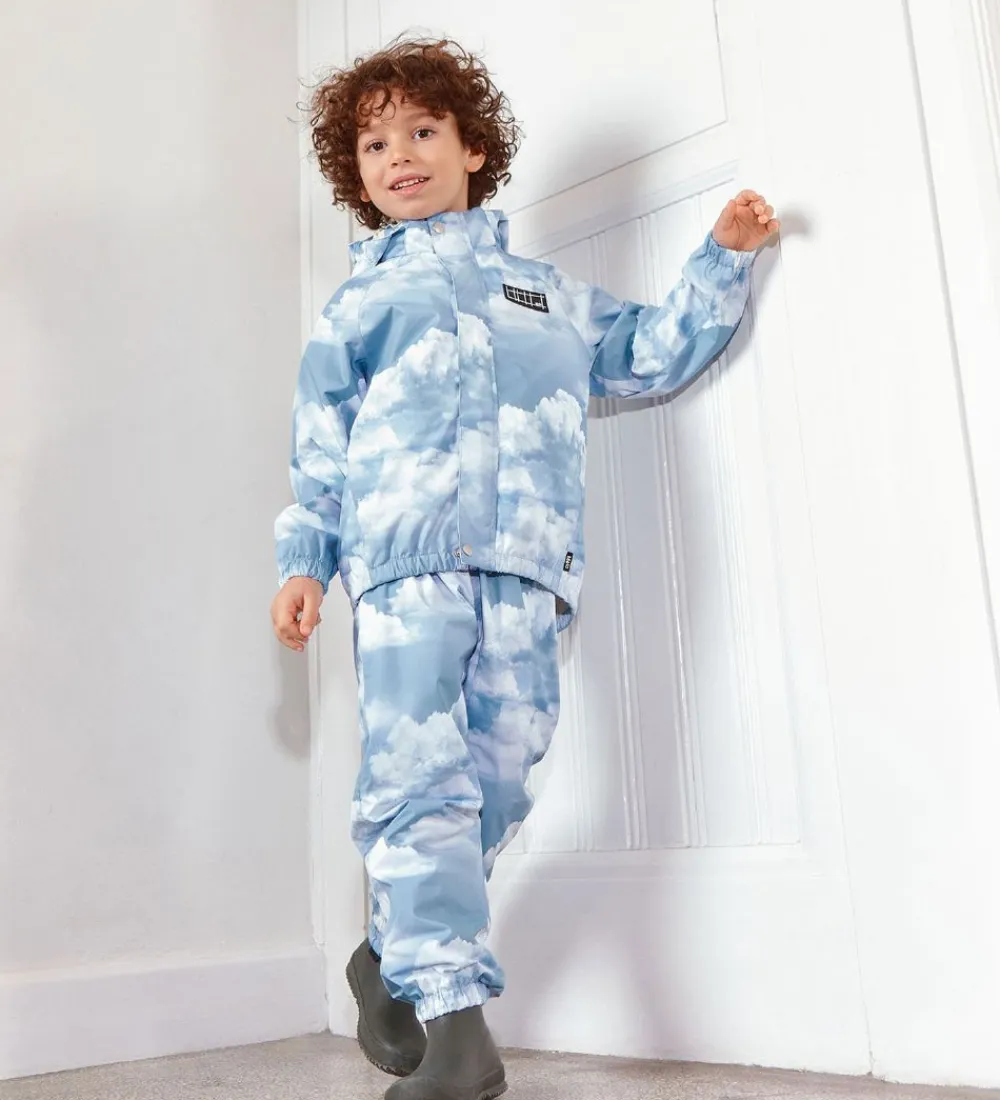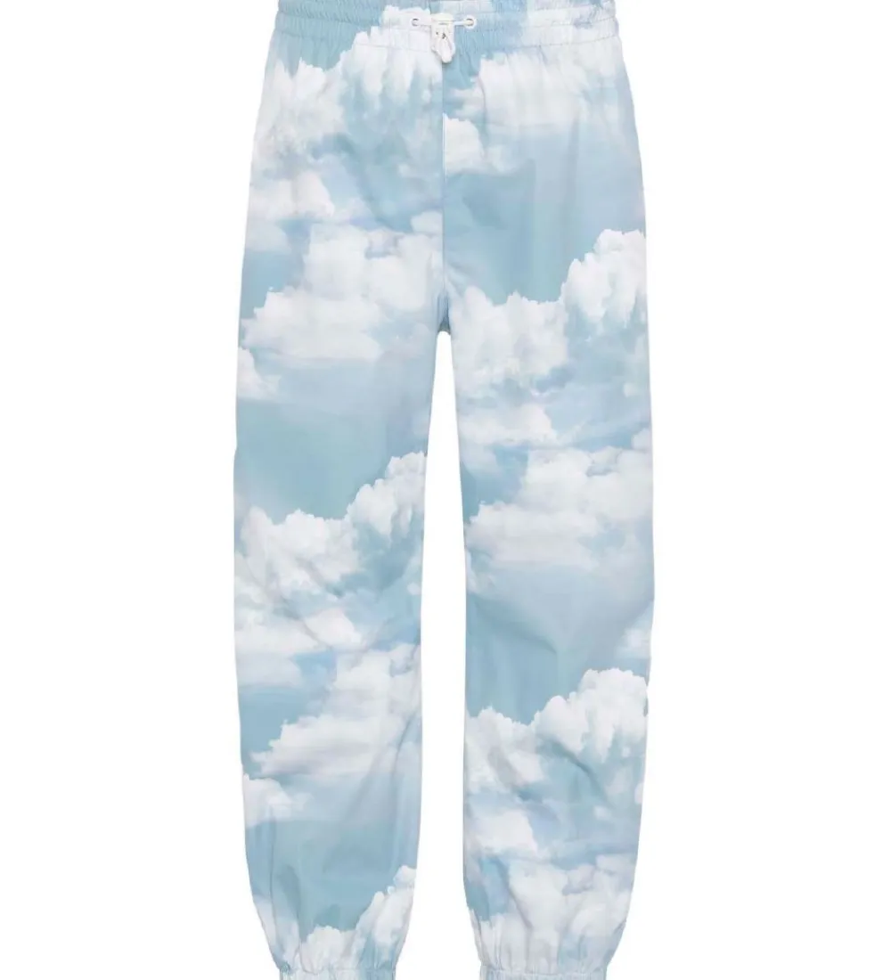 Fine Molo regnbukser i lyseblå med et alloverprint af hvide skyer.