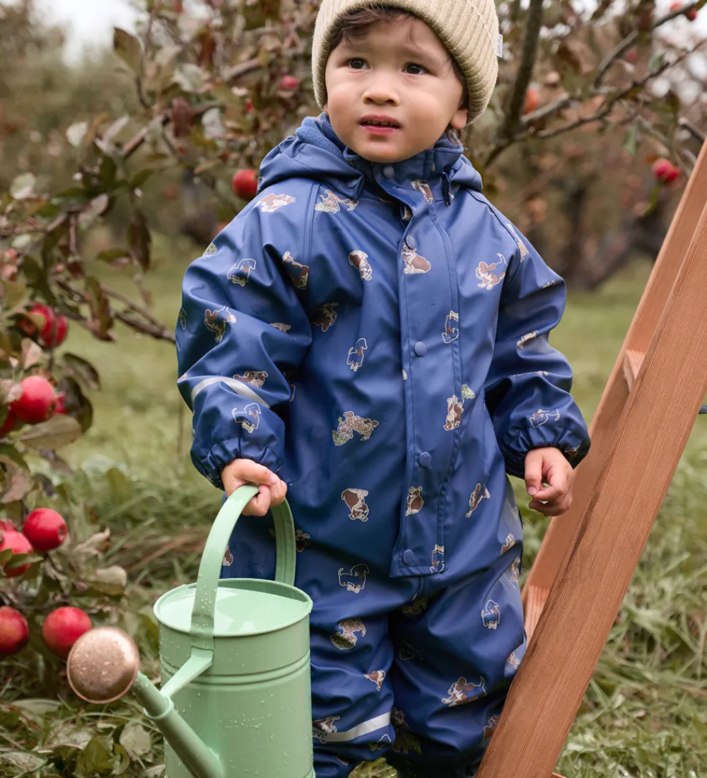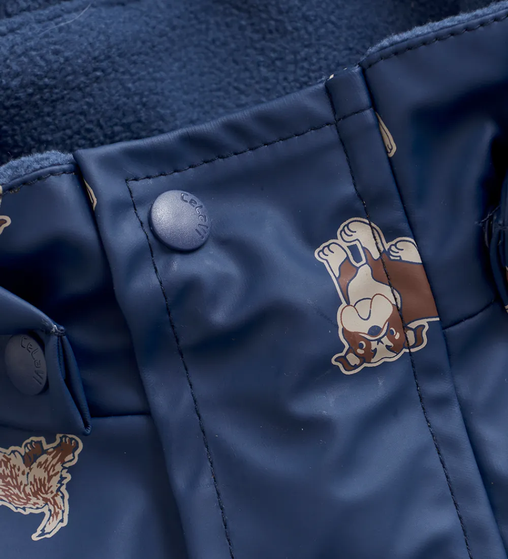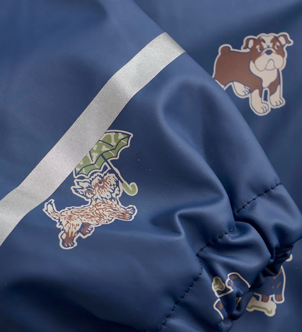 Flot CeLaVi regndragt i mørkeblå med alloverprint af forskellige hunde med en refleksstribe rundt om højre ærme og højre ben og et reflekslogo på venstre ærme og på hætten.