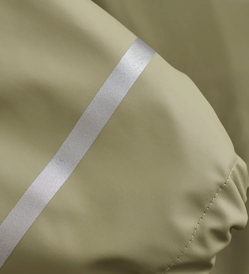 Lækker CeLaVi regndragt i støvet armygrøn med en refleksstribe rundt om højre ærme og højre ben og et reflekslogo på venstre ærme og på hætten.