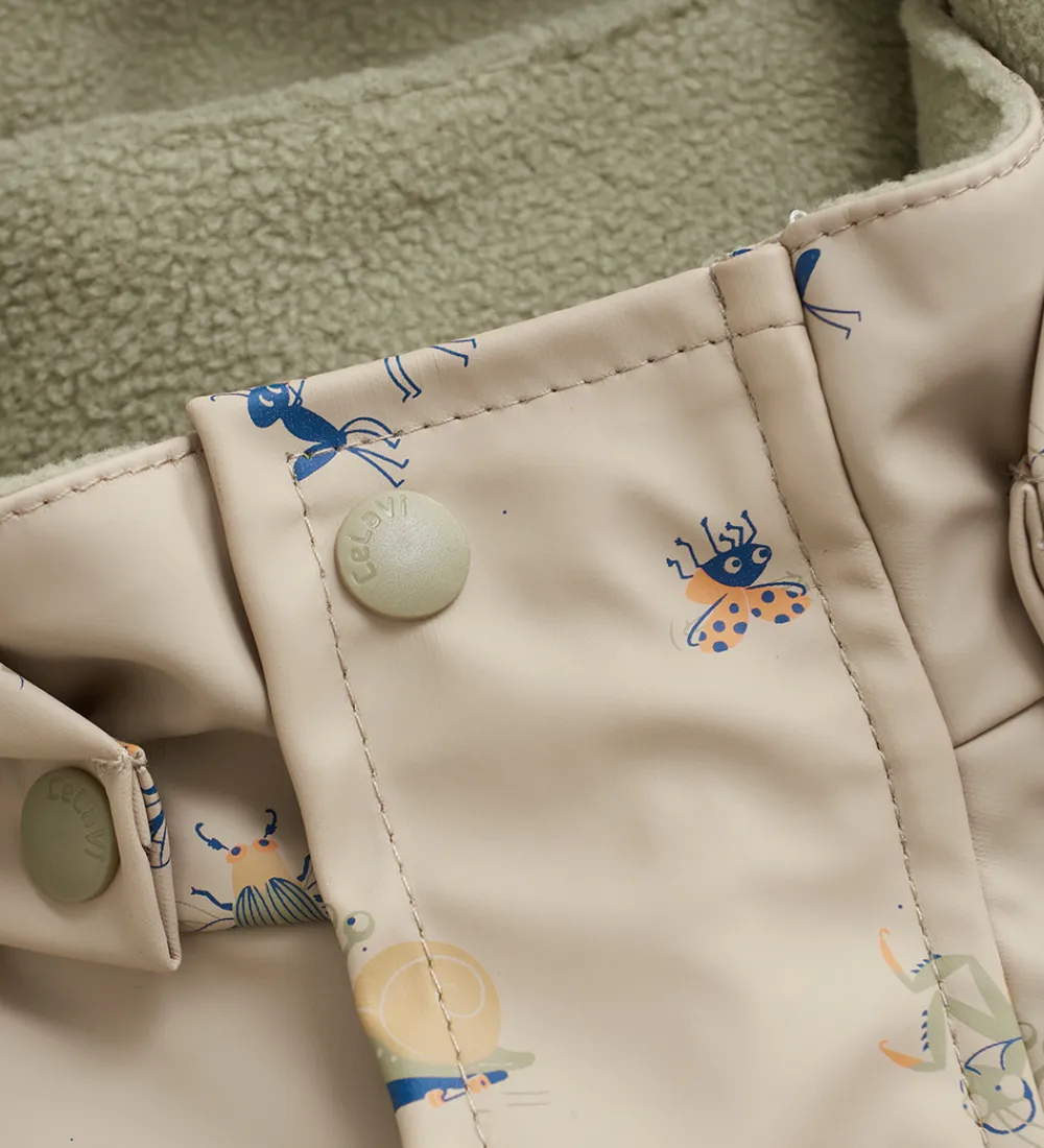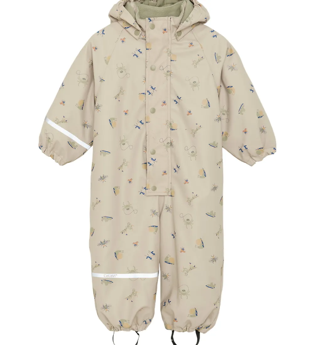 Flot CeLaVi regndragt i beige med alloverprint af forskellige seje insekter med en refleksstribe rundt om højre ærme og højre ben og et reflekslogo på venstre ærme og på hætten.