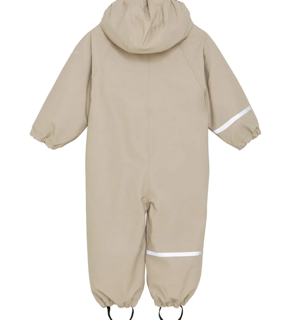 Lækker CeLaVi regndragt i beige med en refleksstribe rundt om højre ærme og højre ben og et reflekslogo på venstre ærme og på hætten.