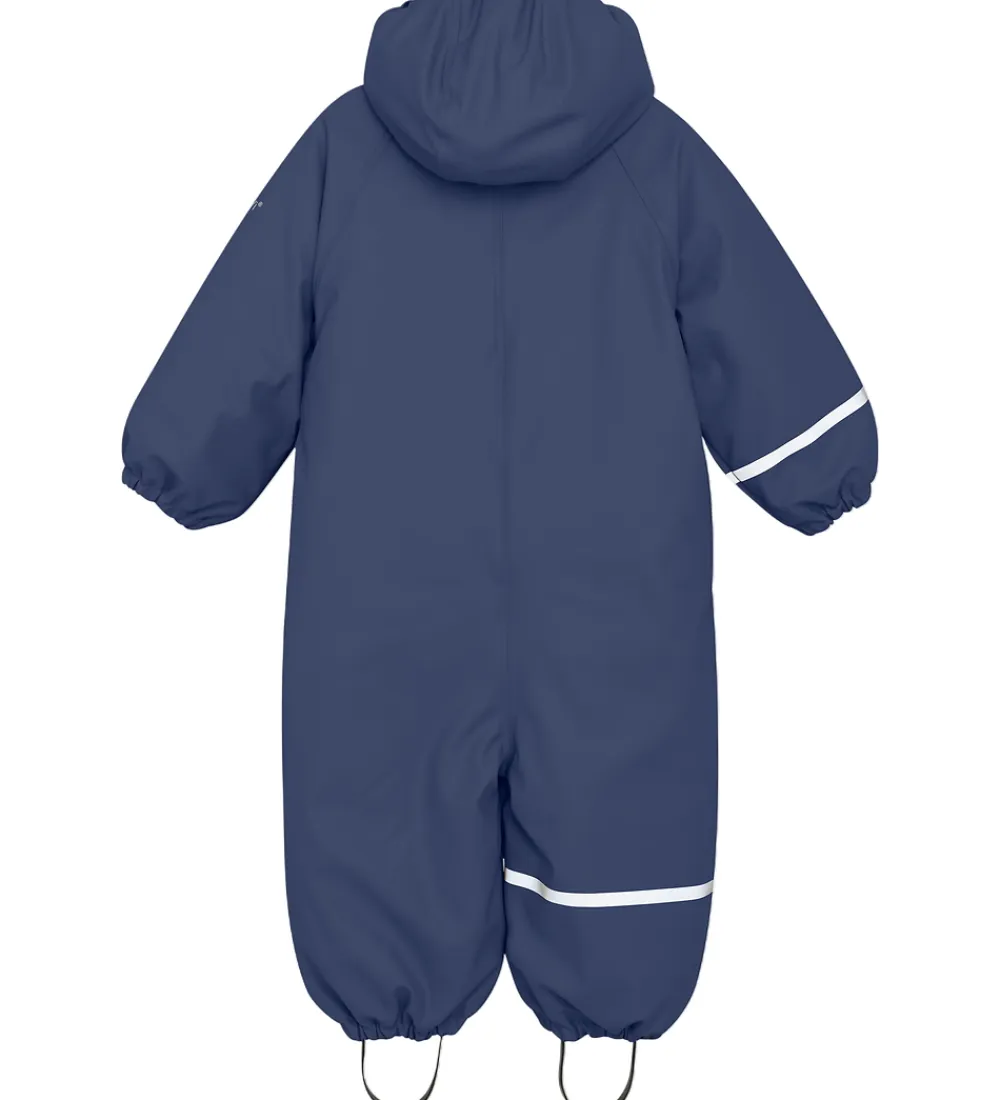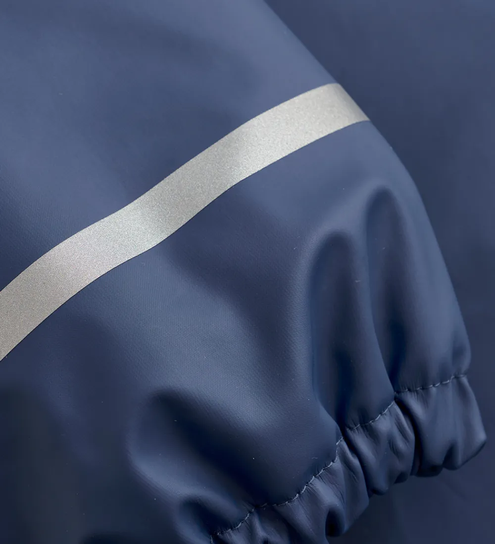 Dejlig CeLaVi regndragt i mørkeblå med en refleksstribe rundt om højre ærme og højre ben og et reflekslogo på venstre ærme og på hætten.