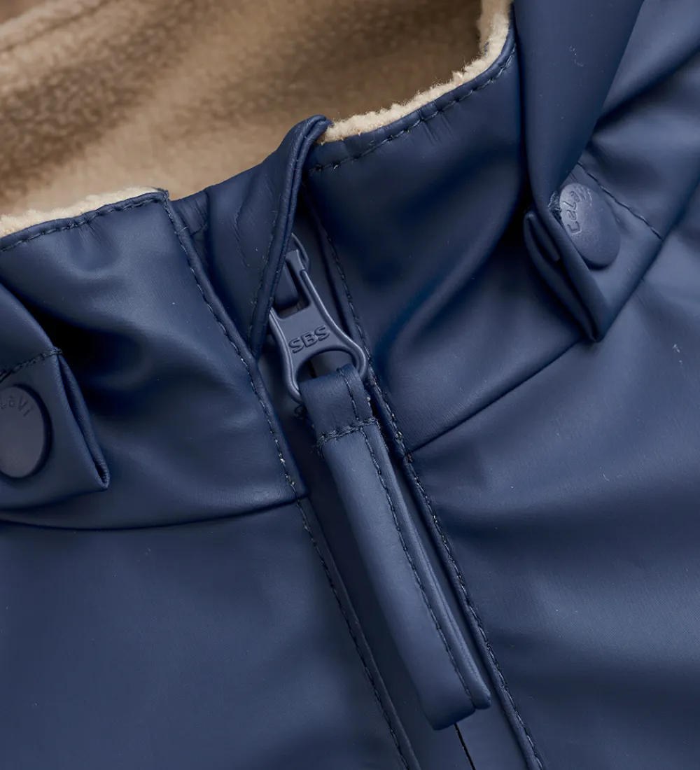 CeLaVi regndragten åbnes fortil med lynlås med hagebeskytter og indvendig vindstolpe. Regndragten er varmt vatteret og har et glatvævet for med lodrette syninger.