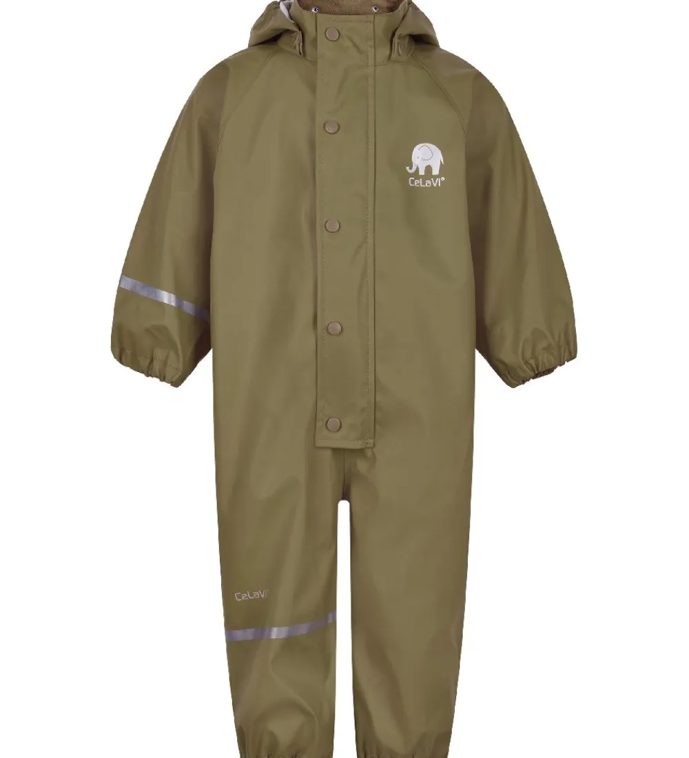 CeLaVi regndragten har en aftagelig hætte, som sidder fast med trykknapper. I toppen af hætten er der en elastikkant, og i halsåbningen er der blødt fleece. Ærmerne og buksebenene har smalle elastikkanter, og der er praktiske, justerbare elastikstropper til at at sætte under støvlerne.