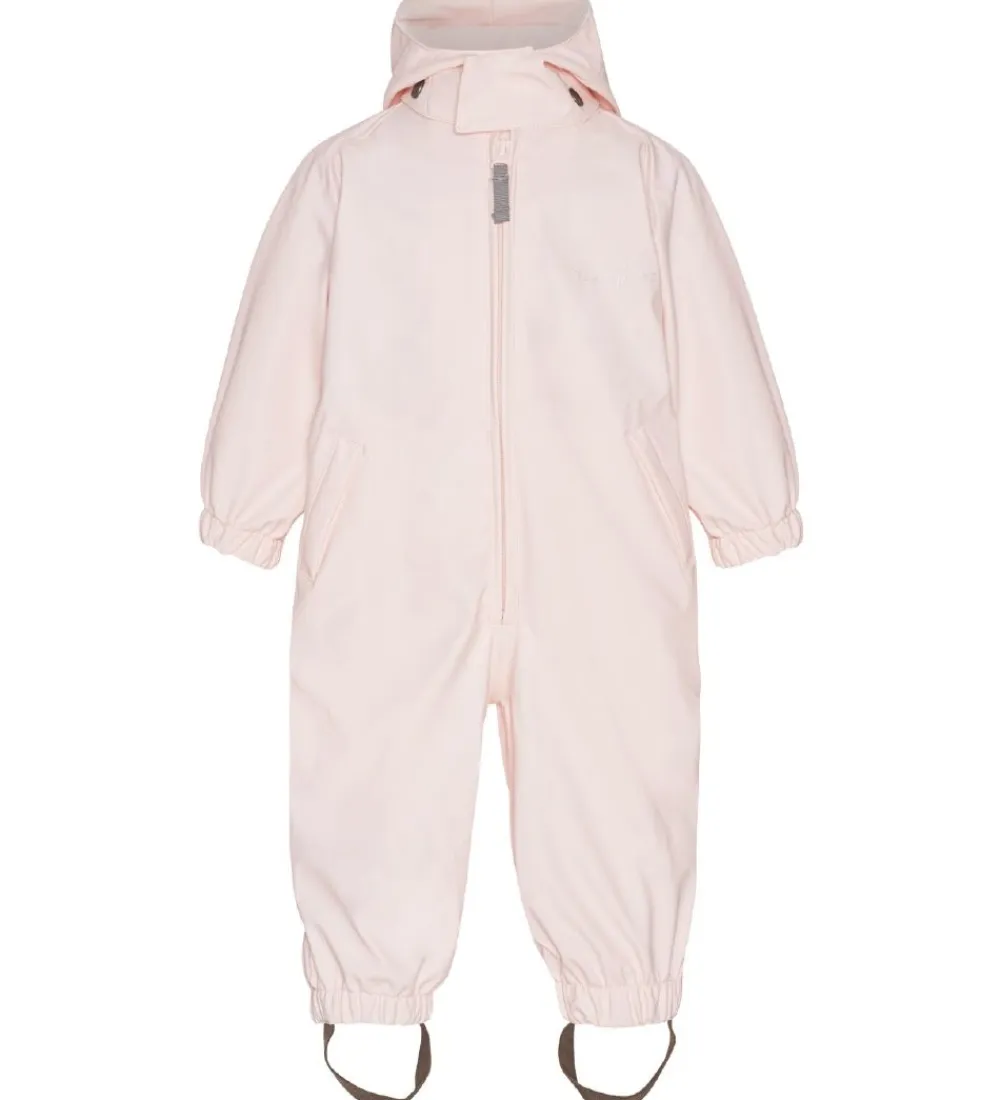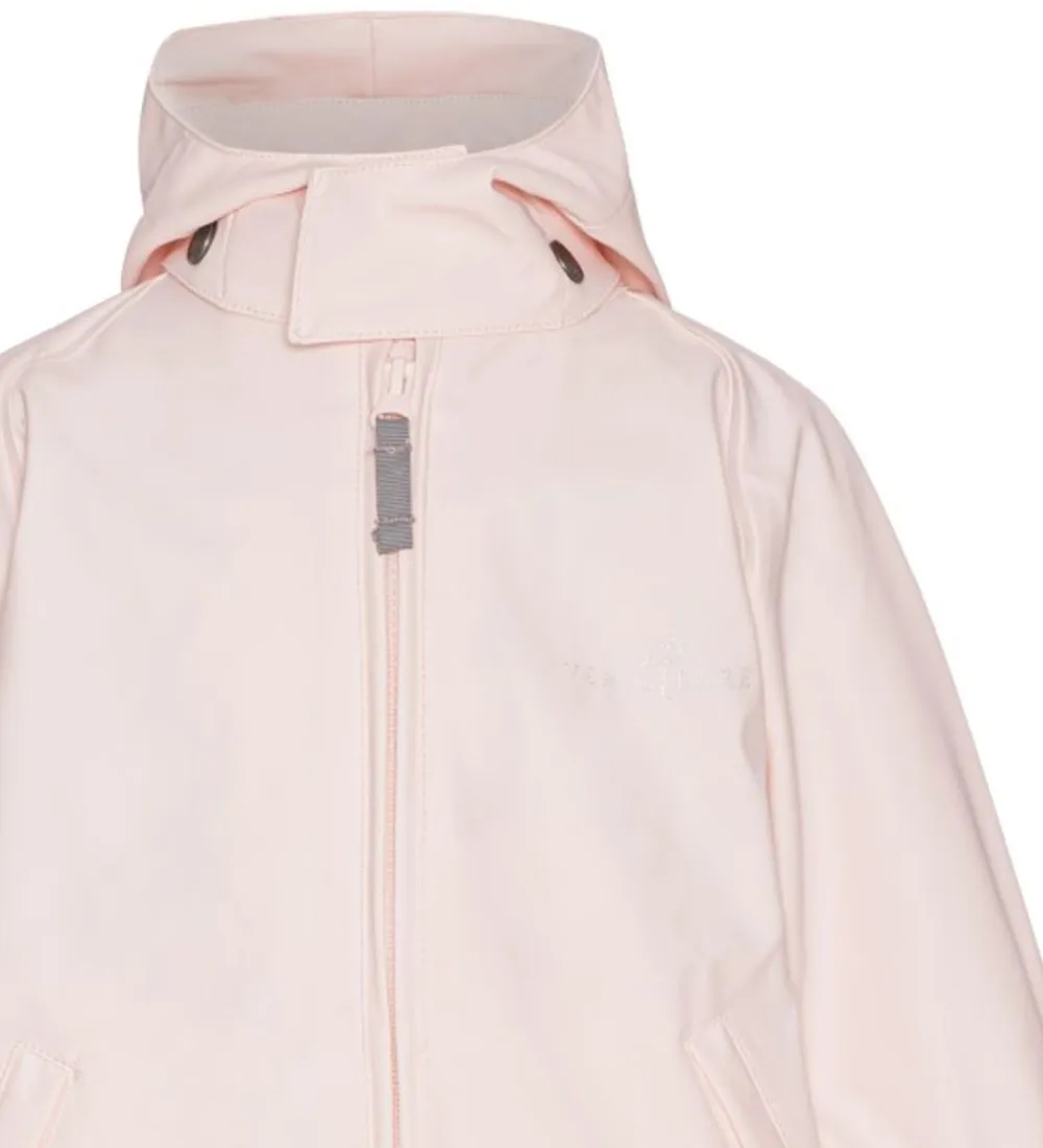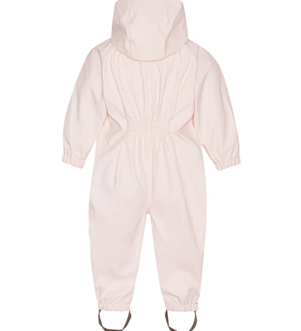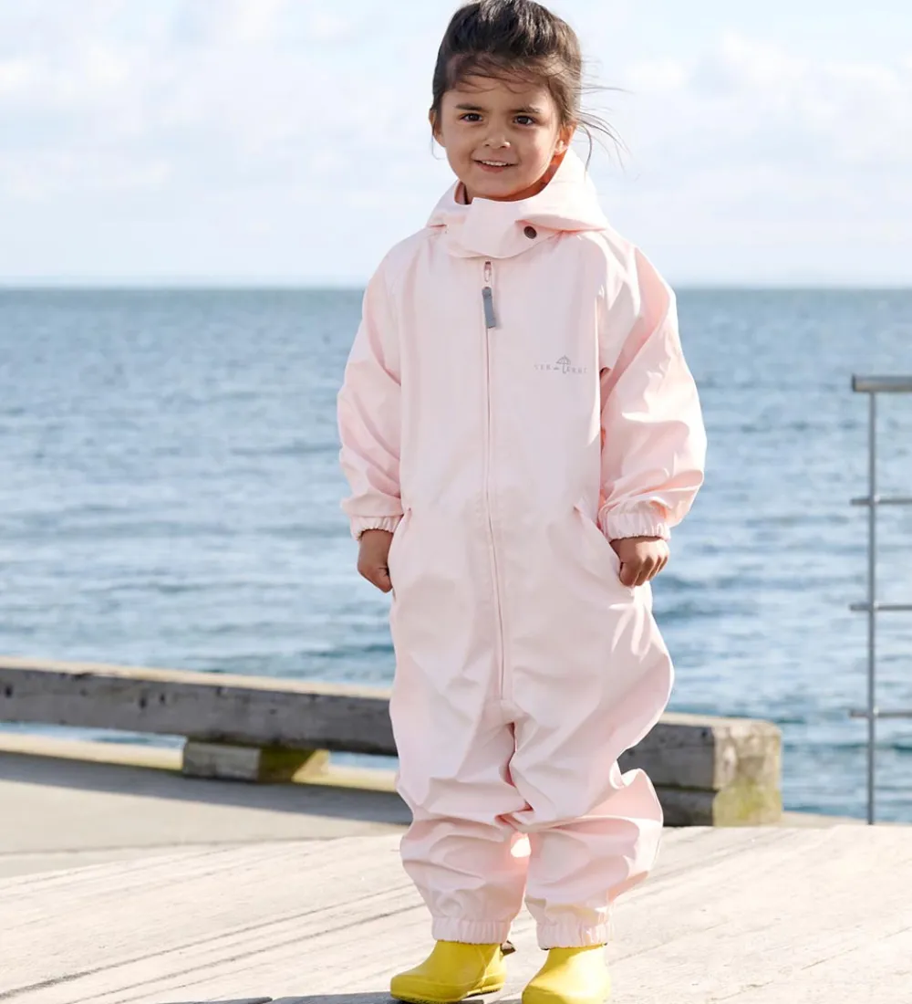 Smuk Ver de Terre regndragt i ensfarvet pudderrosa PU med et refleksprint af “Ver de Terre” på venstre bryst og ben.