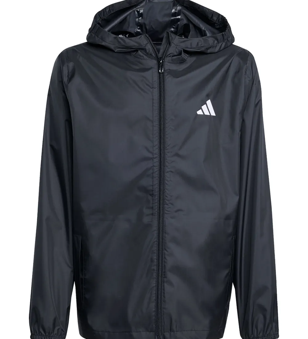 Funktionel adidas Performance regnjakke i en dyb sort med et lille diskret logoprint på brystet i hvid. Regnjakken har en praktisk hætte og lynlås foran, der sikrer optimal beskyttelse.