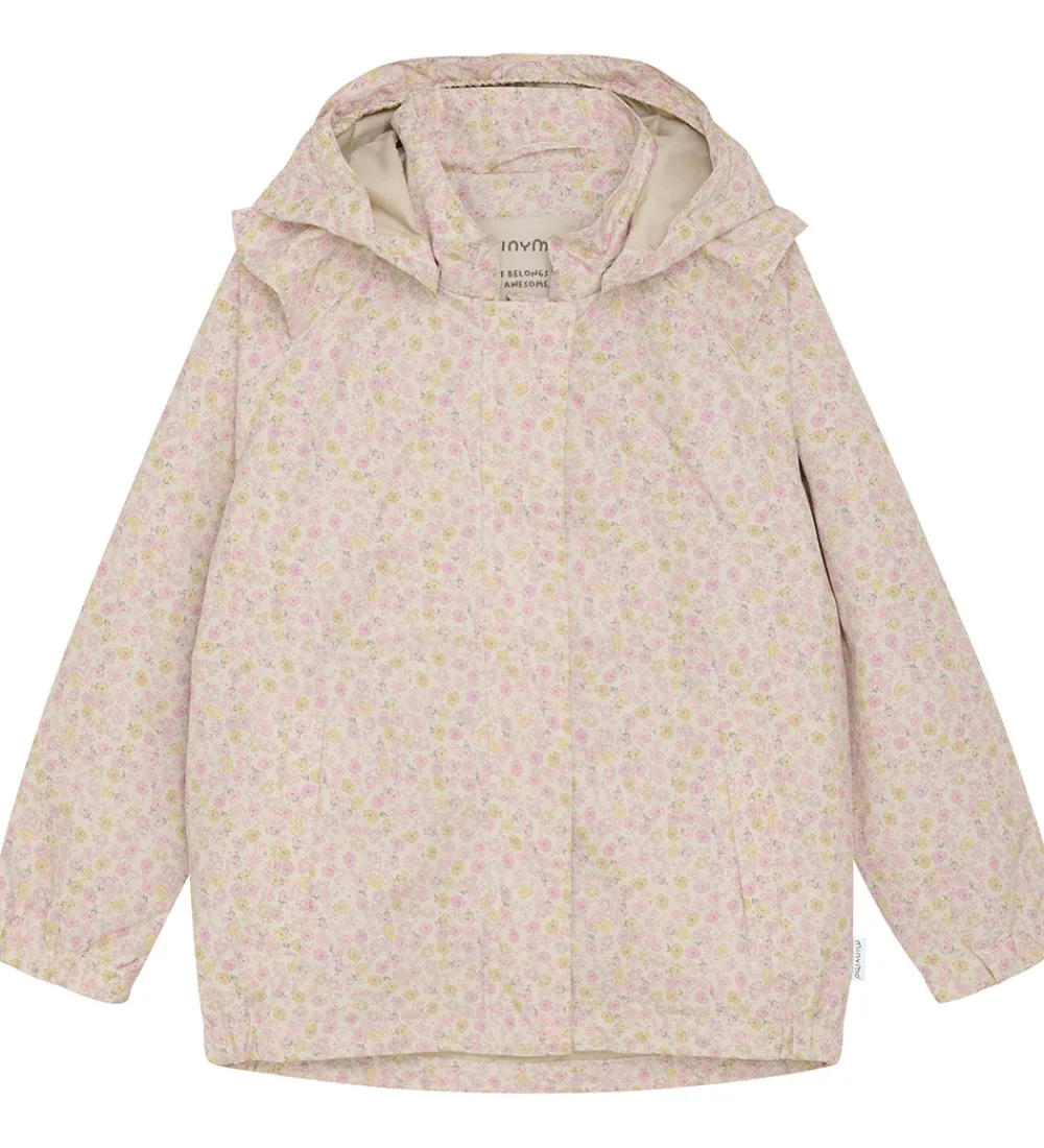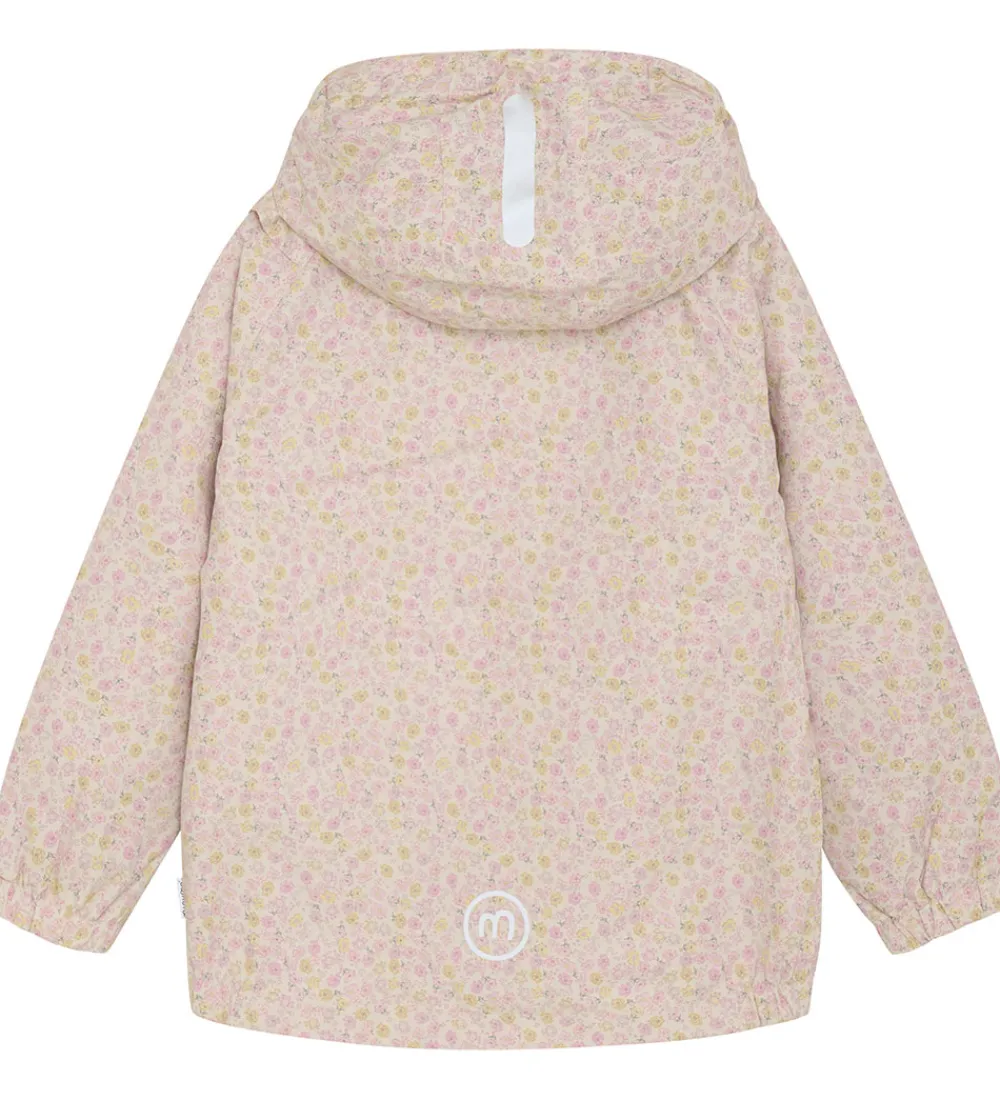 Sej Minymo regnjakke i sart gul og med et alloverblomsterprint i rosa, gule og grønne nuancer. Regnjakken er i en lækker PE-kvalitet.