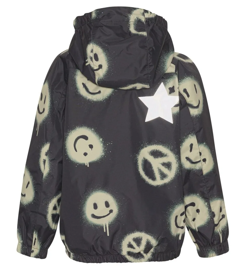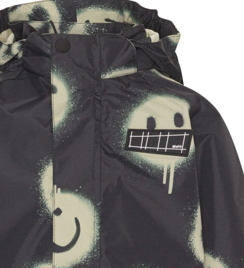 Sej Molo regnjakke i sort med et alloverprint af smileys i et beige grafitti-design samt med en gummi-logoapplikation på venstre bryst. Regnjakken er desuden udstyret med en stor, reflekterende Molo-stjerne på højre skulderblad.
