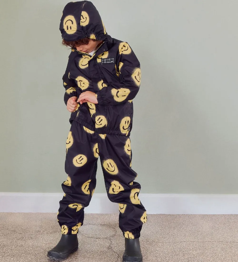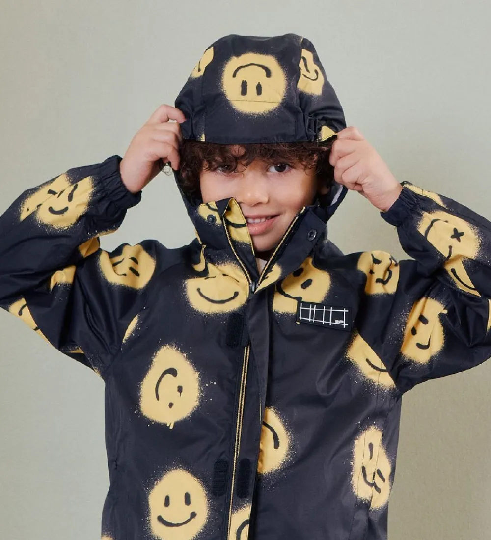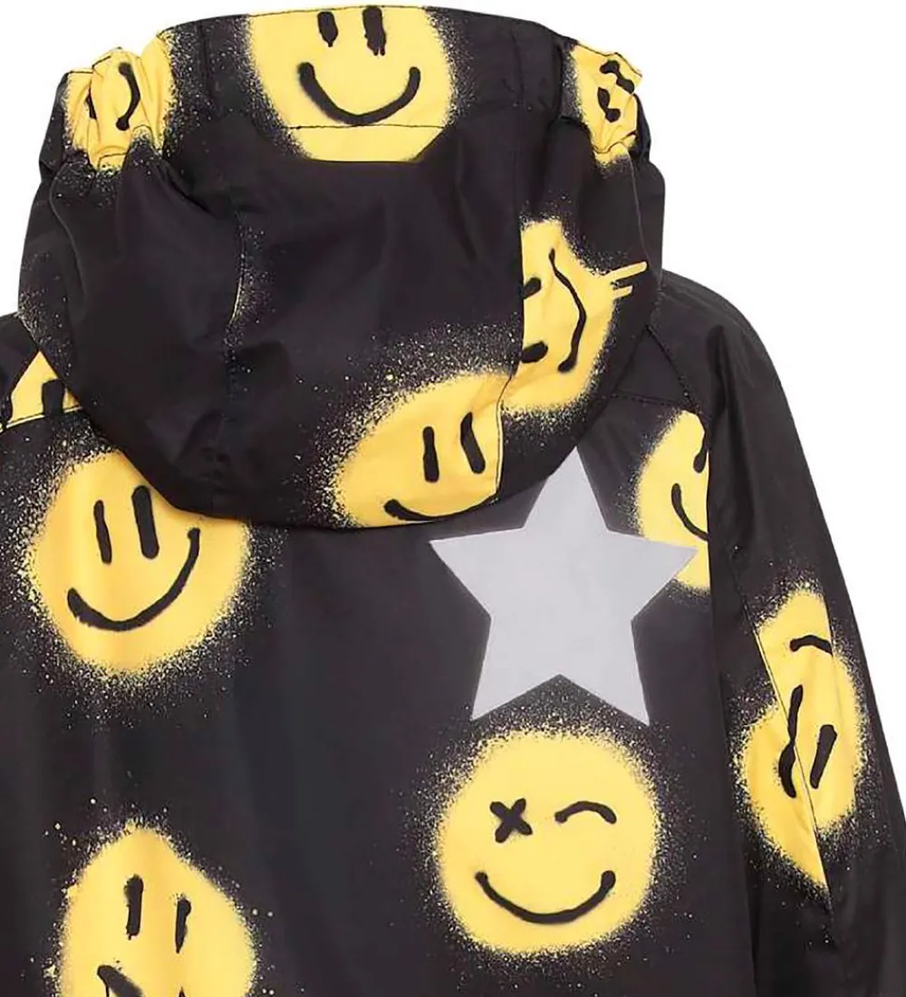 Lækker Molo regnjakke i sort med et alloverprint af smileys i et gult grafitti-design samt med en sort gummiapplikation med et hvidt gittermønster.