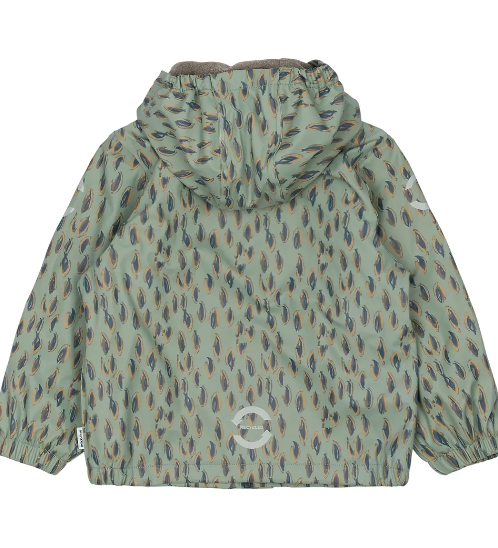 Sejt Mikk-Line regntøj af PU bestående af en regnjakke og et par regnbukser med seler. Regnbukserne er i ensfarvet mørkeblå, mens regnjakken er i støvet grøn med et fjerlignende alloverprint i burne nuancer og navyblå.