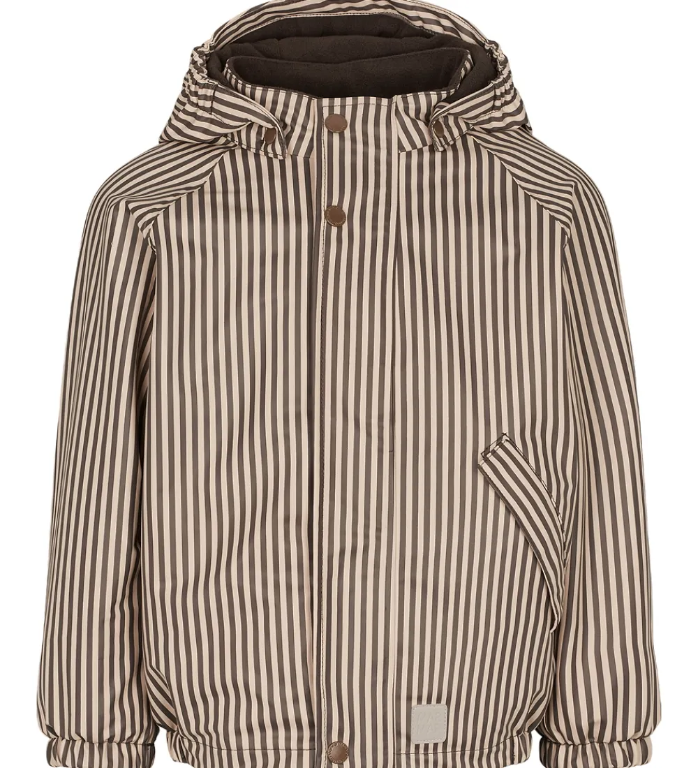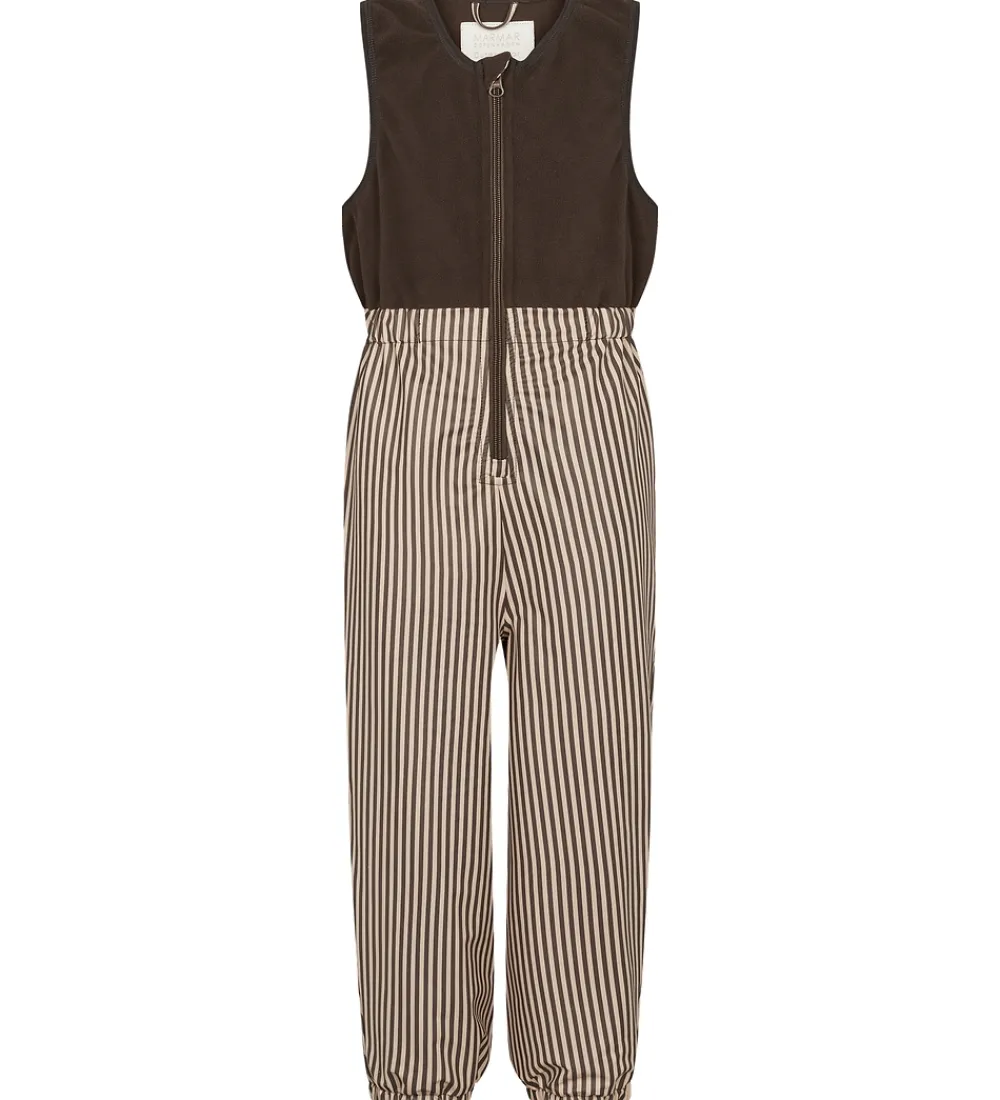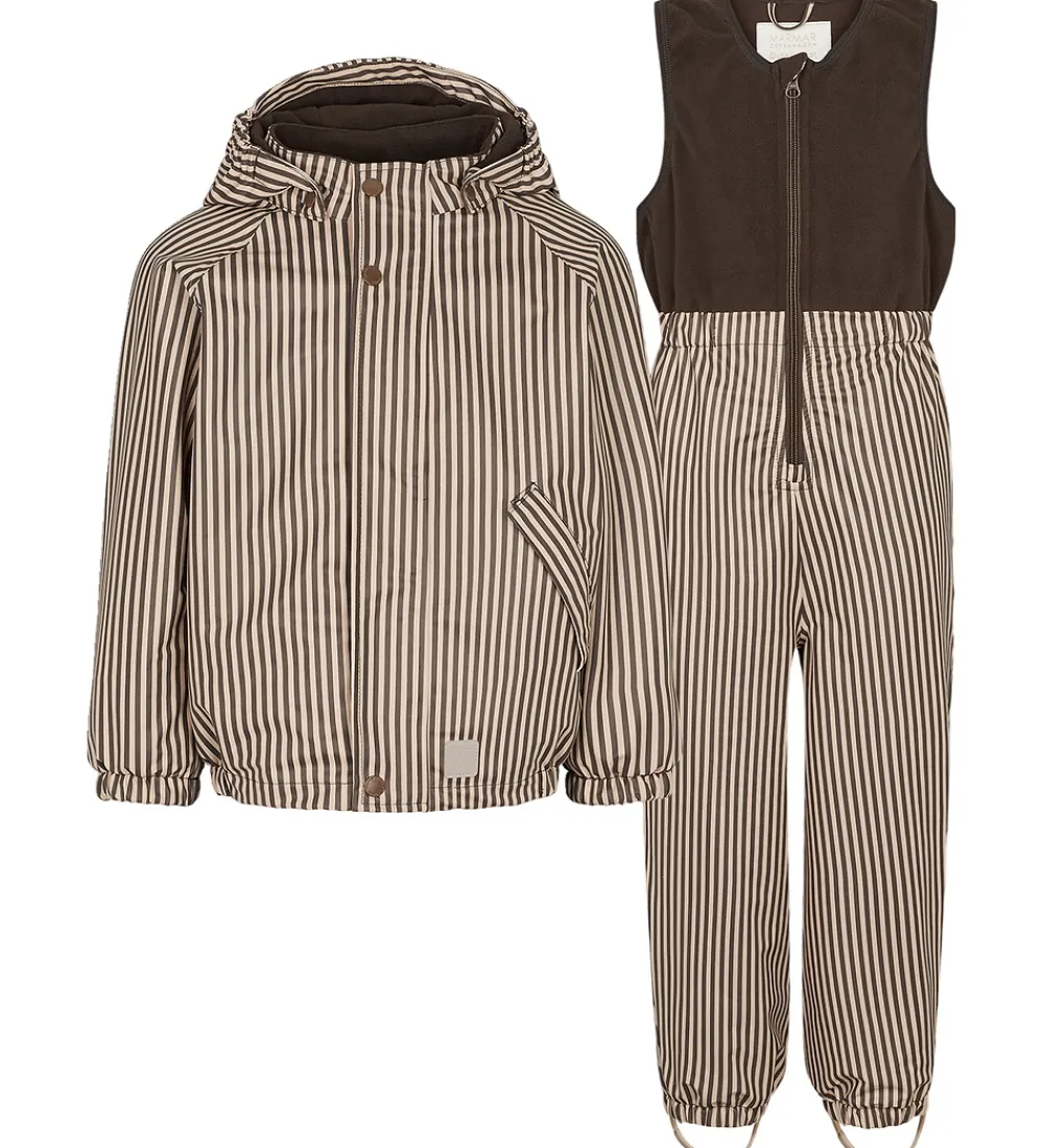 Flot MarMar regntøj i beige PU med smalle, mørkebrune striber. Regntøjet består af en regnjakke og et par regnbukser med seler