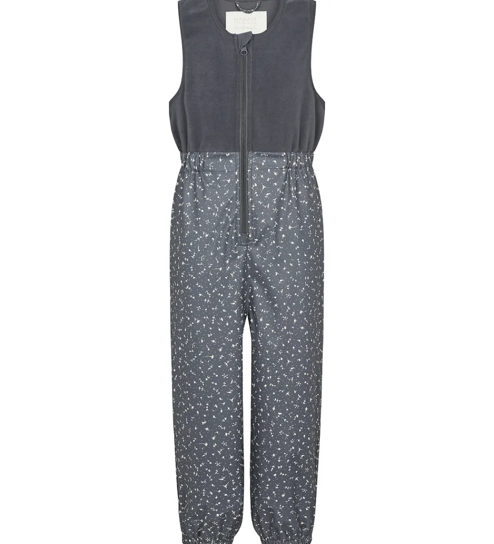 Fint MarMar regntøj i navy PU med et cremefarvet blomsterprint. Regntøjet består af en regnjakke og et par regnbukser med seler