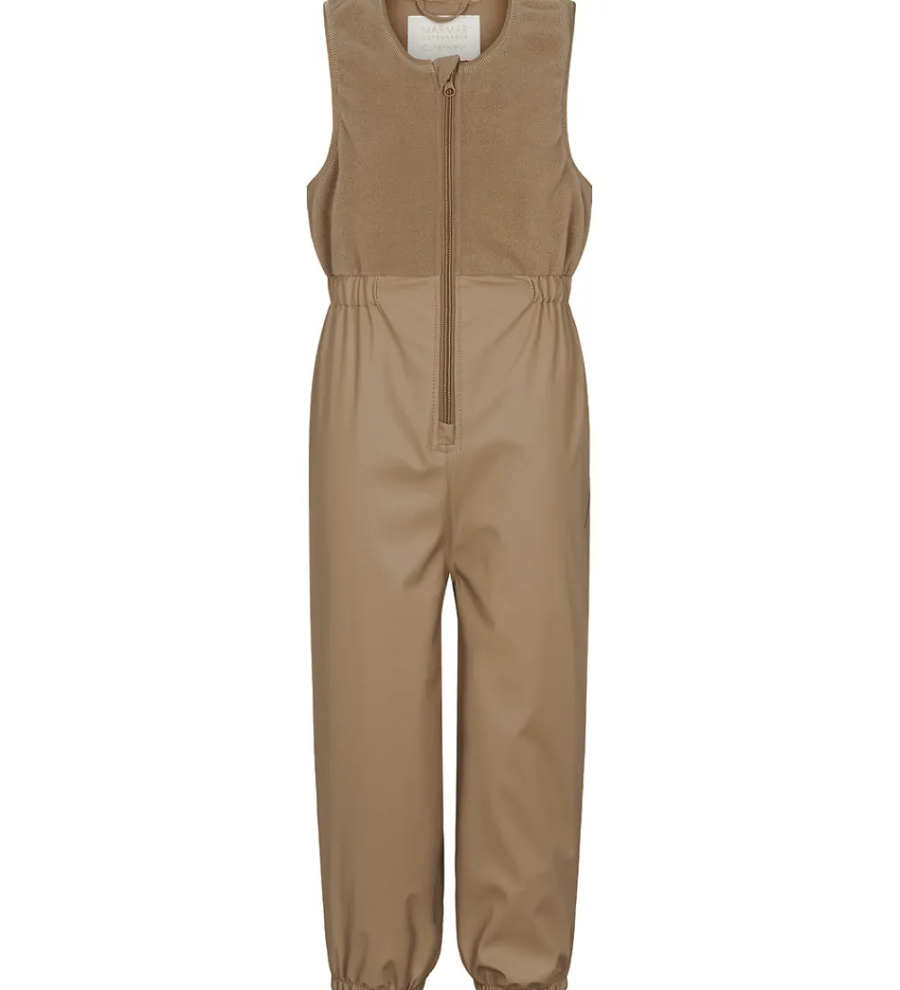 Lækkert MarMar regntøj i ensfarvet brunt PU. Regntøjet består af en regnjakke og et par regnbukser med seler.
