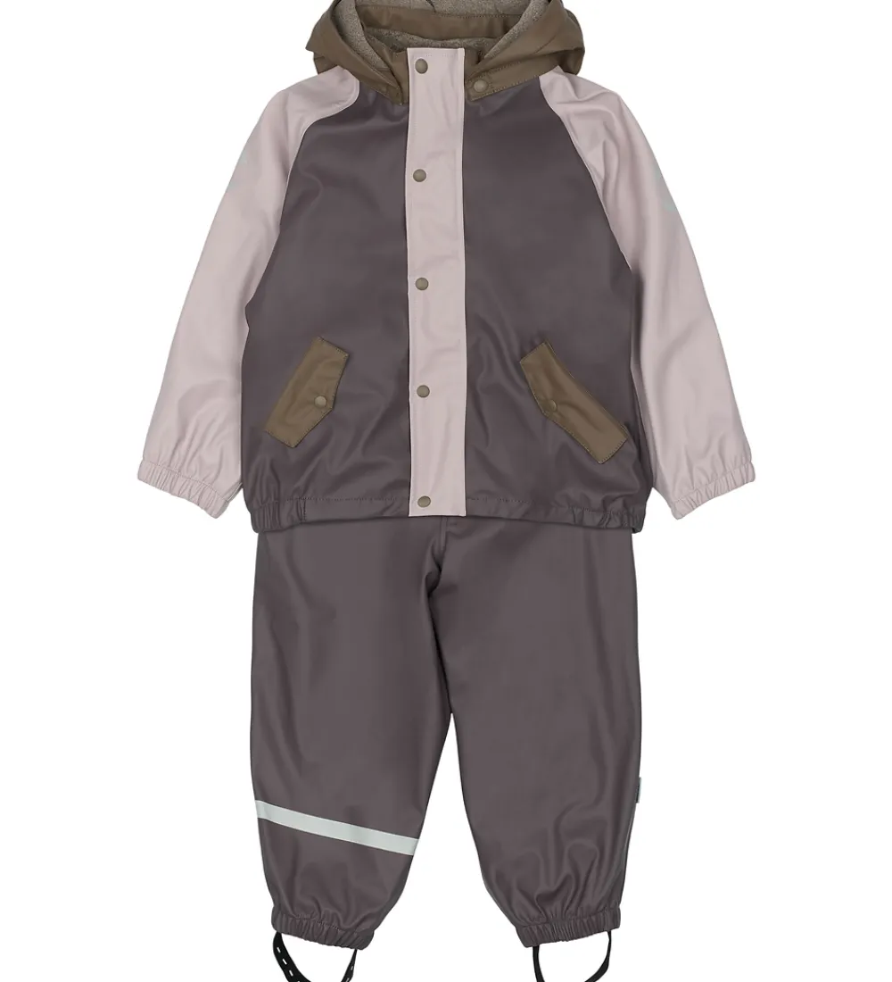 Fint Mikk-Line regntøj bestående af en regnjakke og et par regnbukser med seler af PU i en farvekombination af mørk, støvet lilla, rosa og brun og med velplacerede refleksdetaljer.