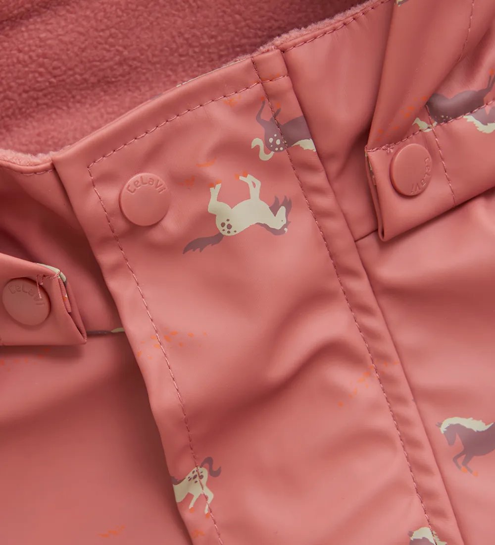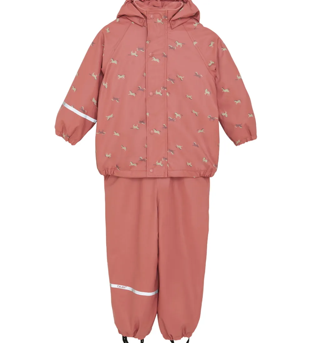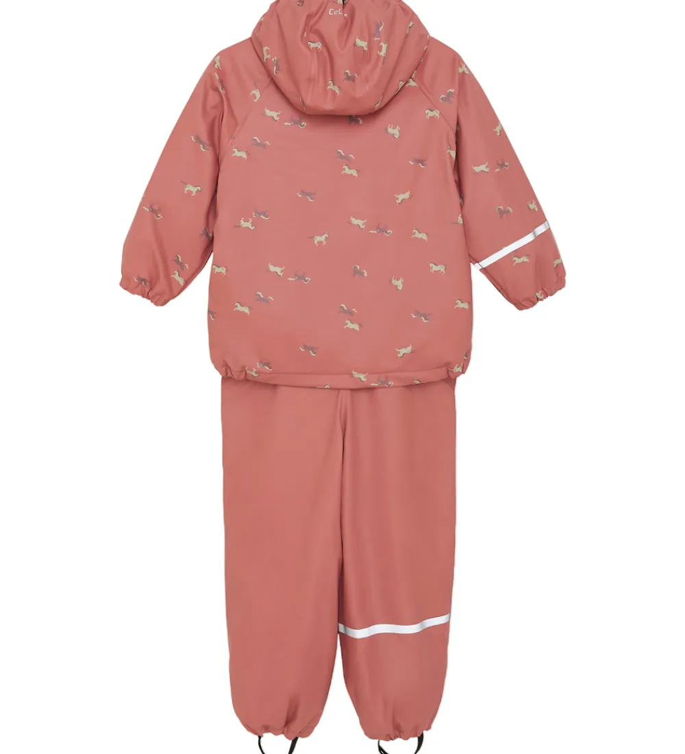 Skønt CeLaVi regntøj af PU i mørk støvet rosa med lyst hesteprint, bestående af en regnjakke og et par regnbukser med seler. Regntøjet er forsynet med praktiske reflekser.