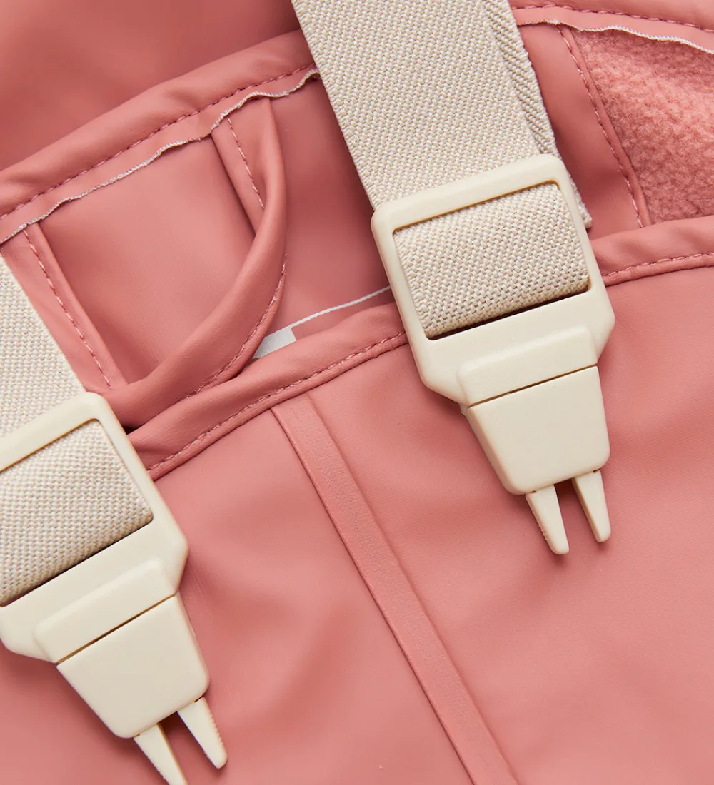 Regnbukserne har justerbare elastikseler, som kan åbnes fortil med klikspænder. Bukserne kan strammes ind i siderne med en trykknap. Regnbukserne har elastikkanter omkring benåbningerne og justerbare, aftagelige elastikstropper til at sætte under gummistøvlerne.