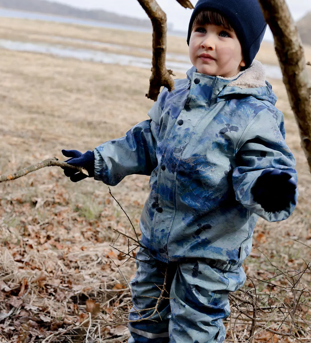 Smart Mikk-Line regntøj, der består af en regnjakke og et par regnbukser i PU med et alloverprint med sneklædte bjerge i blå nuancer og med flyvende ørne.