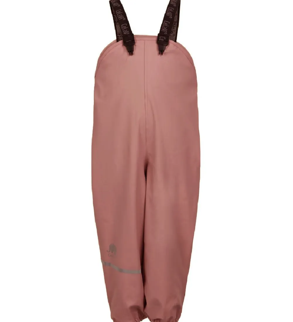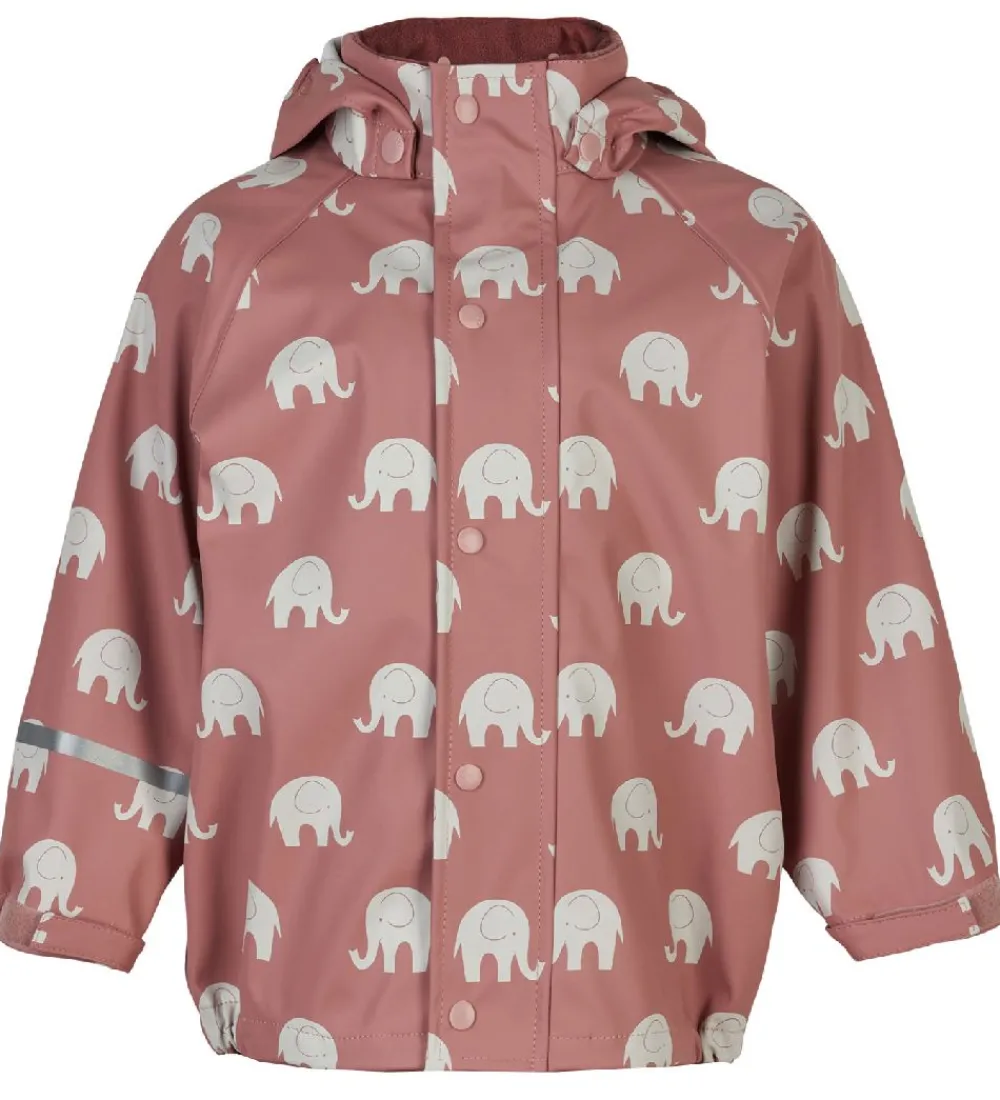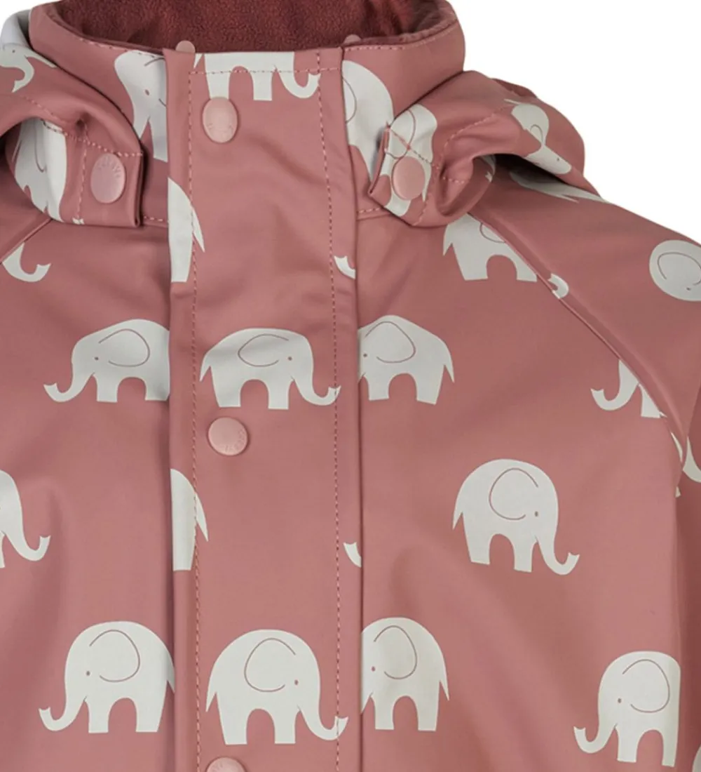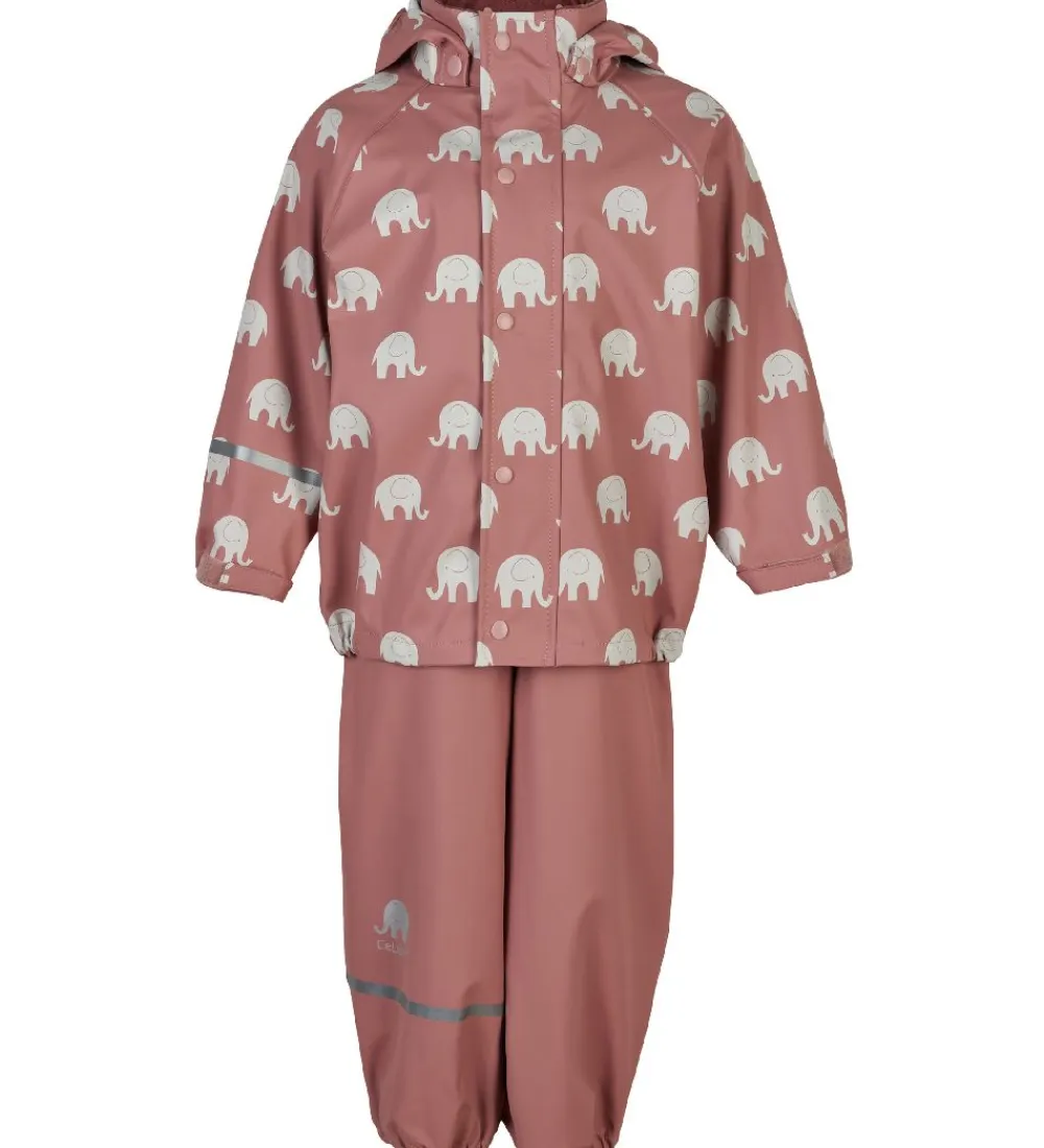 Sødt CeLaVi regntøj i PU, der består af en regnjakke i støvet rosa med hvide elefanter samt et par regnbukser i ensfarvet støvet med seler.