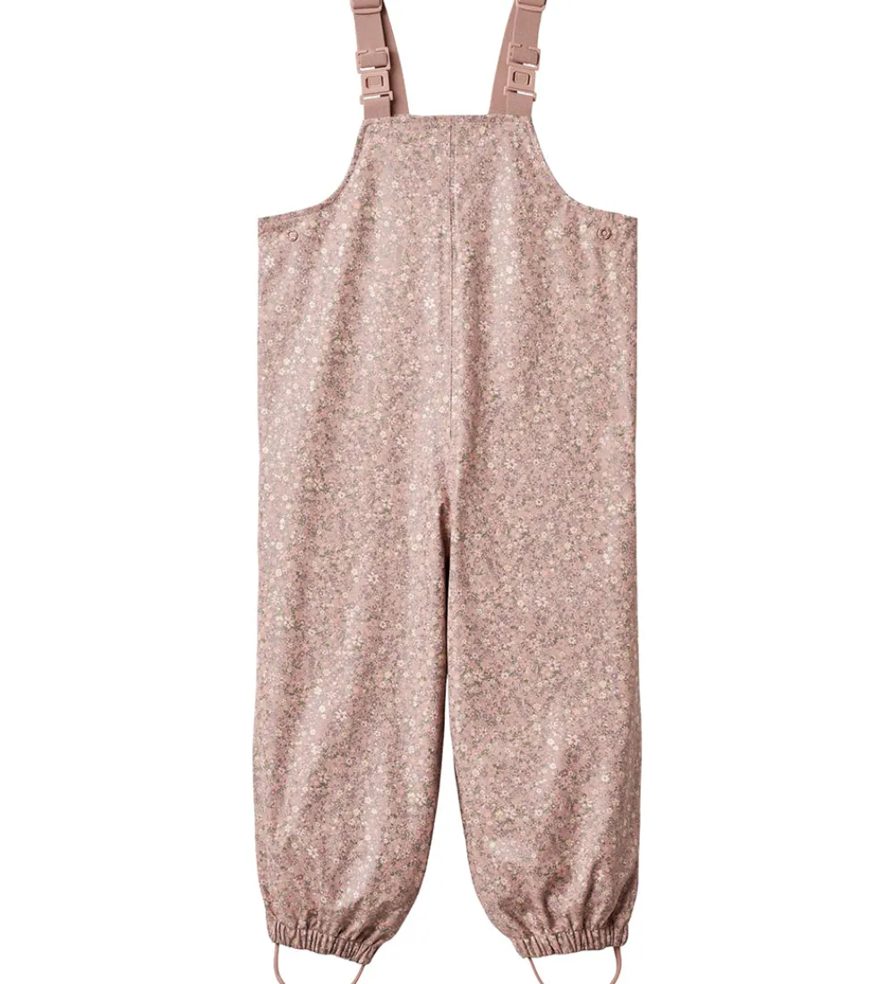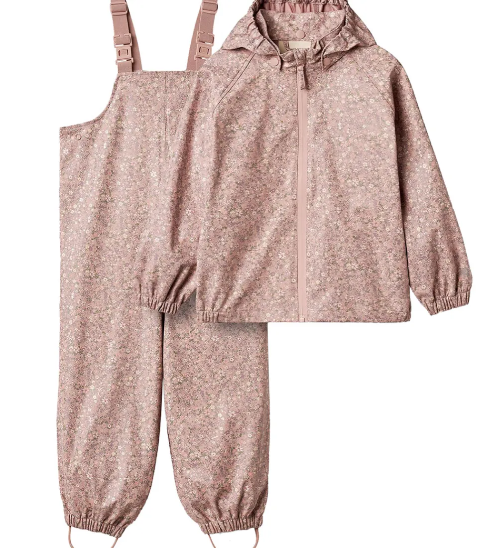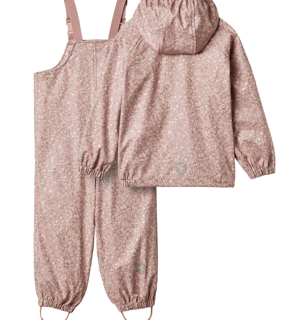 Dejligt Wheat regntøj af PU i rosa med et alloverblomsterprint samt med refleksprint. Regntøjet består af en regnjakke og et par regnbukser med seler.
