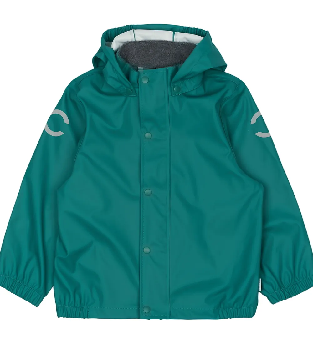 Pænt Mikk-Line regntøj bestående af et par regnbukser med seler og en regnjakke i ensfarvet grønturkis samt med velplacerede refleksdetaljer og -logoer.
