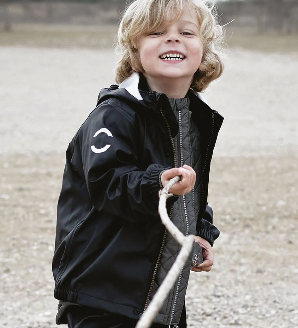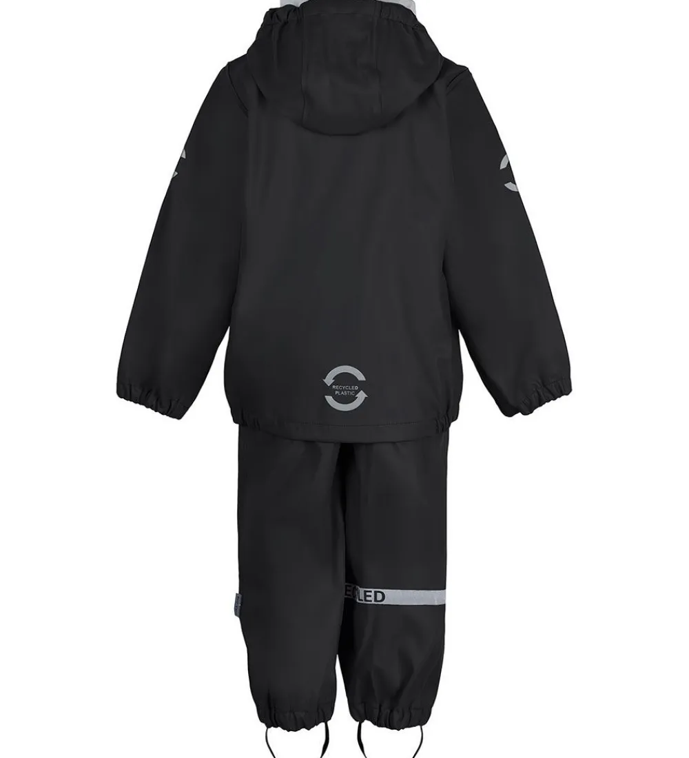 Fint Mikk-Line regntøj bestående af en regnjakke og et par regnbukser i ensfarvet, sort PU.