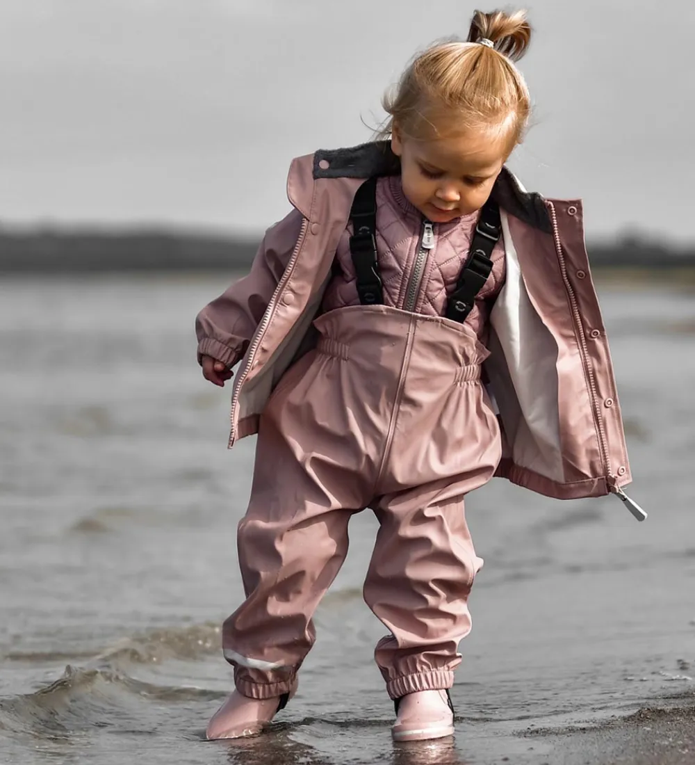 Sødt Mikk-Line regntøj bestående af en regnjakke og et par regnbukser i ensfarvet, mørkerosa PU.