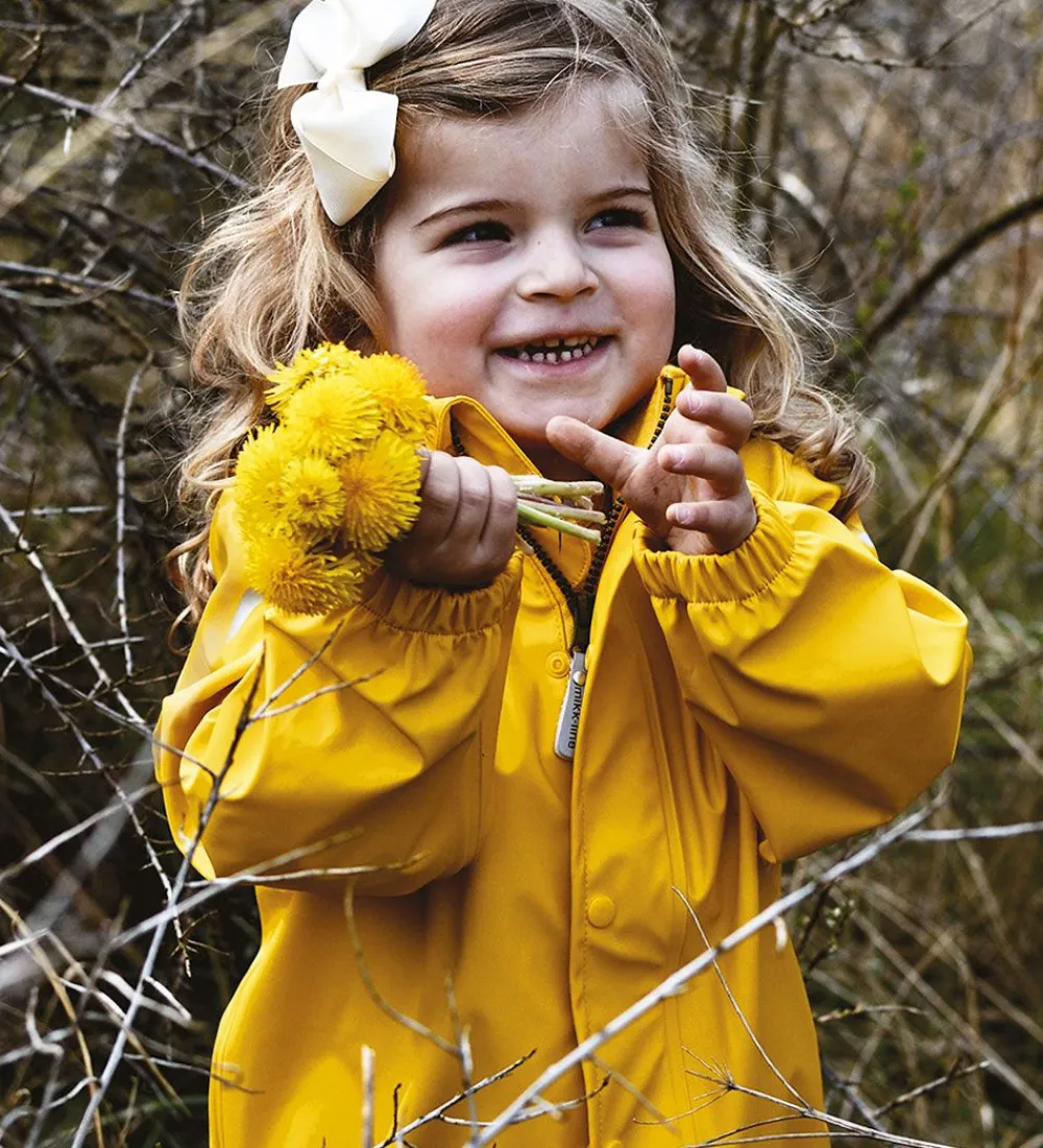 Fint Mikk-Line regntøj bestående af en regnjakke og et par regnbukser i ensfarvet, gul PU.