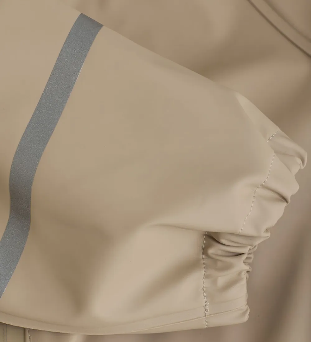 CeLaVi regnjakken har en aftagelig hætte, som fæstnes med trykknapper langs den høje, fleeceforede krave. I toppen af hætten er der en elastikkant, så hætten sidder godt til om ansigtsåbningen. Armåbningerne og livåbningens sider har praktiske elastikkanter. Regnjakken åbnes ved hjælp af en lynlås med dobbelt vindstolpe, som lukkes på ydersiden med trykknapper.