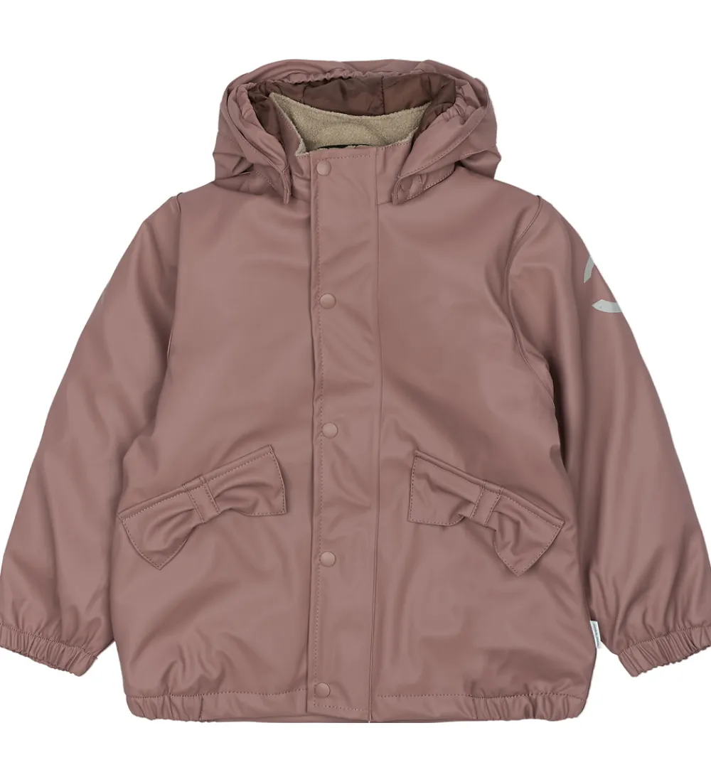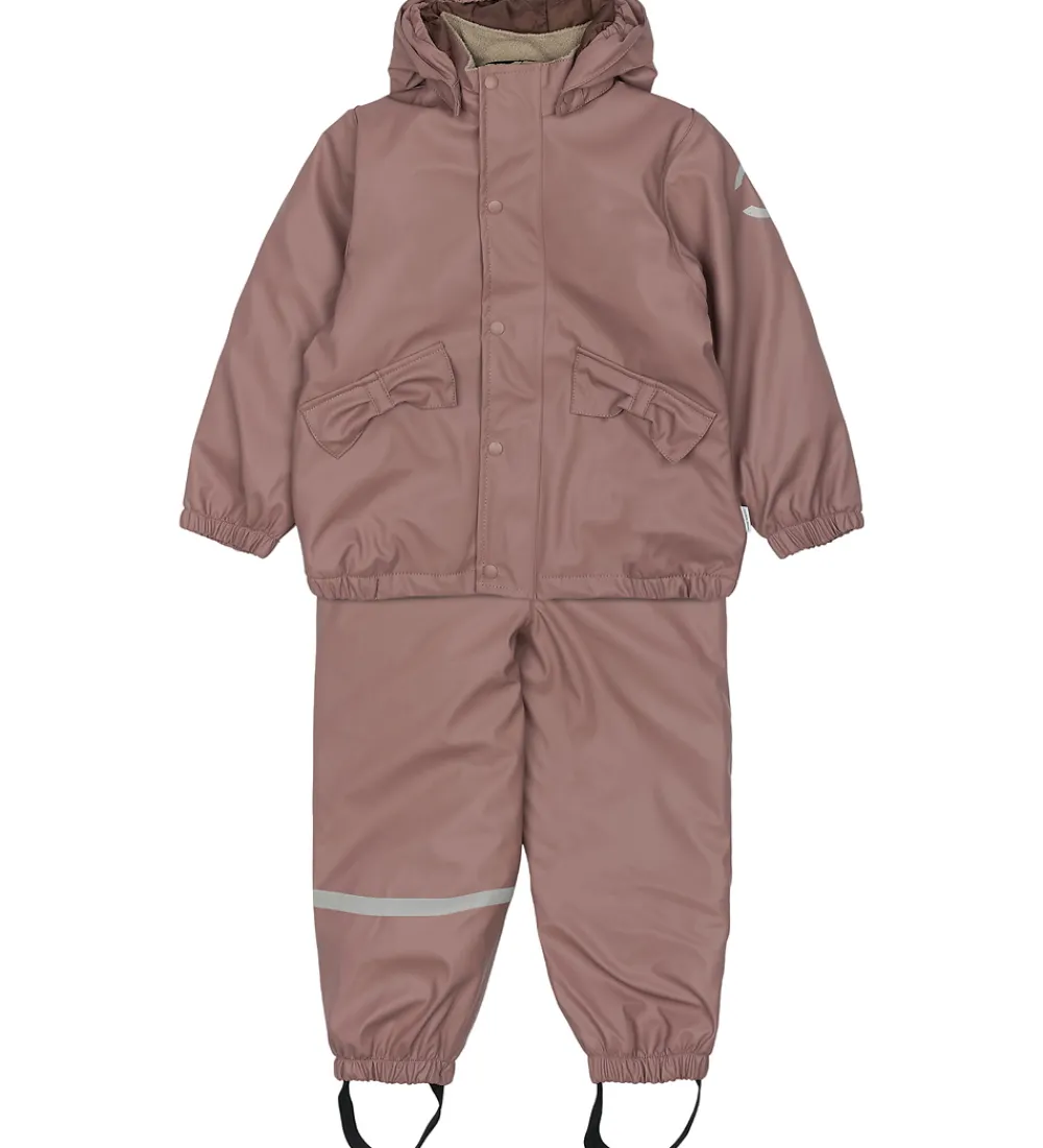 Sødt Mikk-Line regntøj, der består af en regnjakke og et par regnbukser med seler i støvet rosa PU, og på hætten er der et print med en kanin.