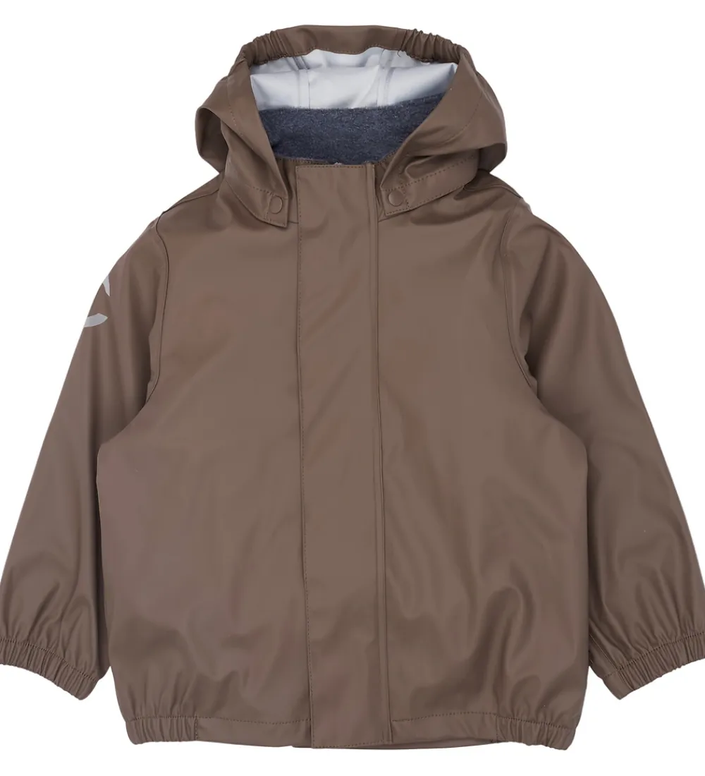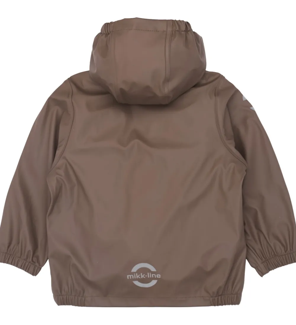 Fint Mikk-Line regntøj bestående af en regnjakke og et par regnbukser i ensfarvet, brunt PU.