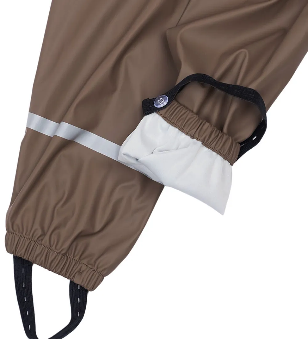 Regnbukserne har en indvendigt justerbar elastikkant i livet og elastikkanter om anklerne samt justerbare elastikstropper, som kan sættes under gummistøvlerne.
