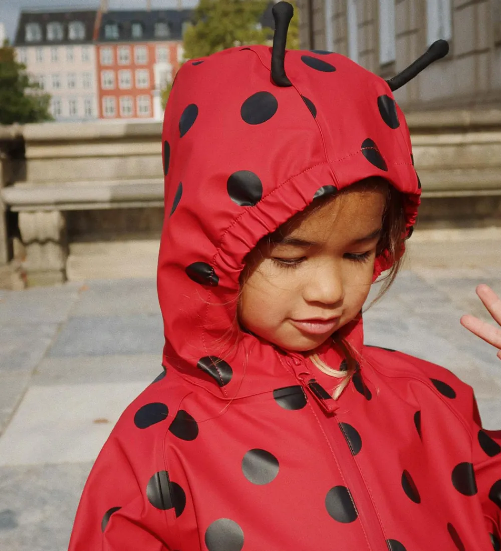 Lækkert Konges Sløjd regntøj i rød med store, sorte prikker.