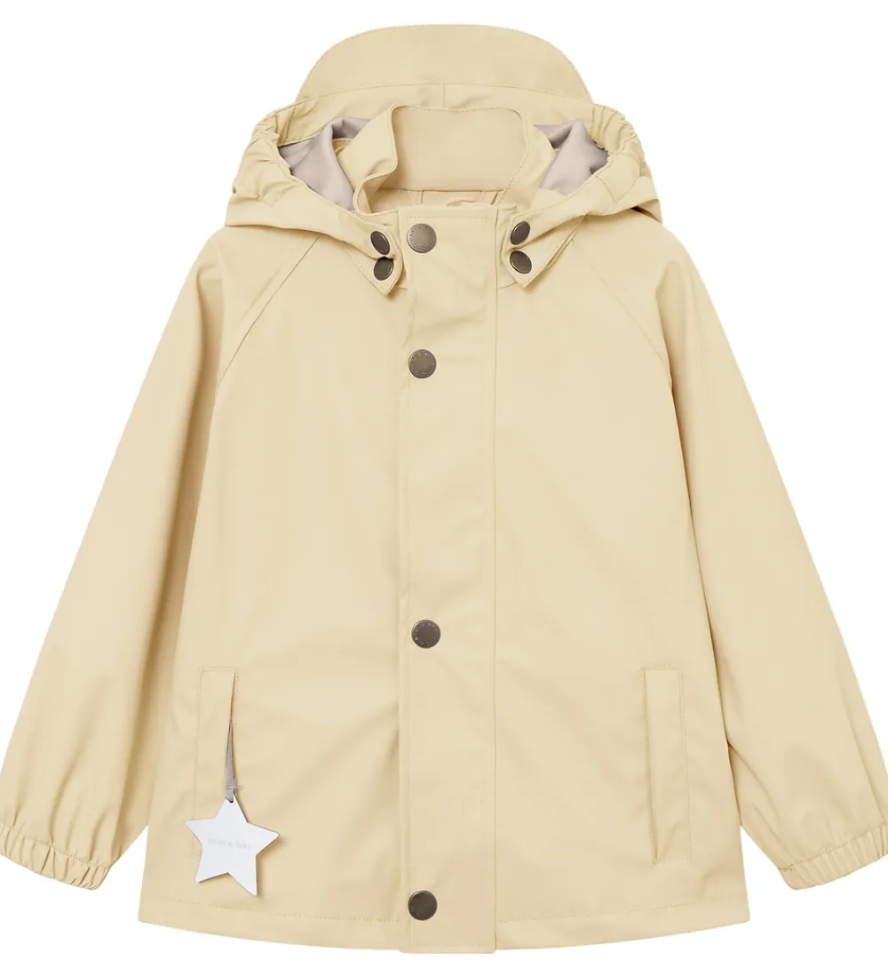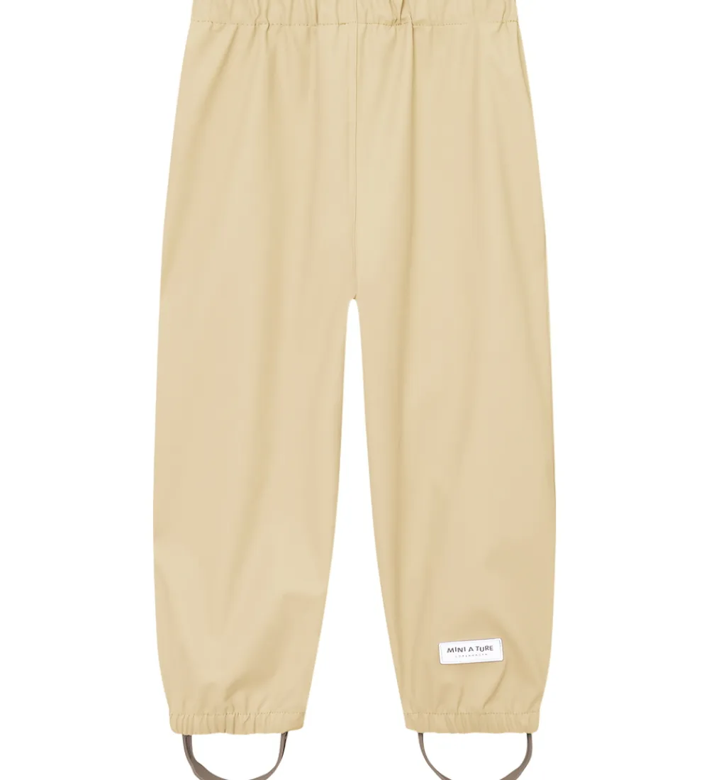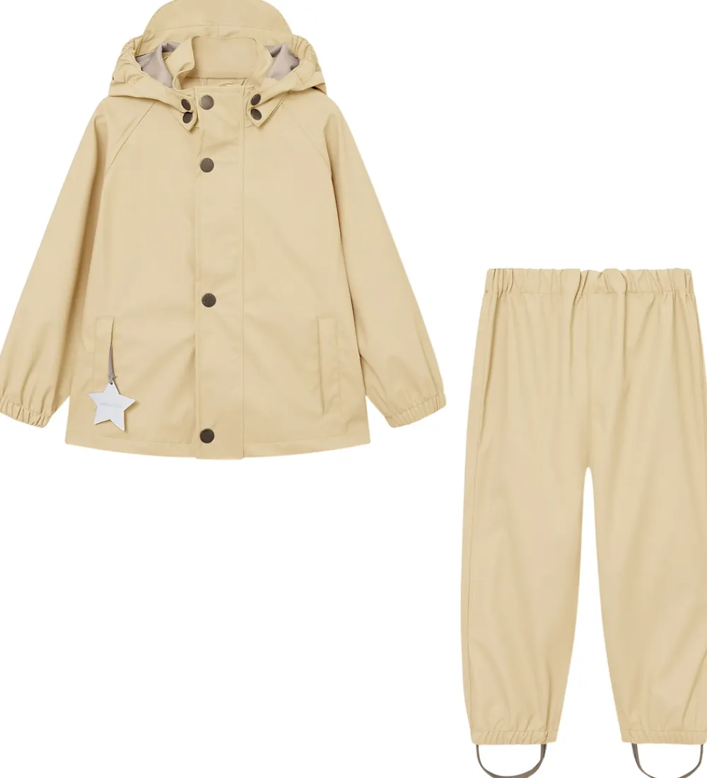 Fint Mini A Ture regntøj bestående af en regnjakke og et par regnbukser i ensfarvet lys beige PU.