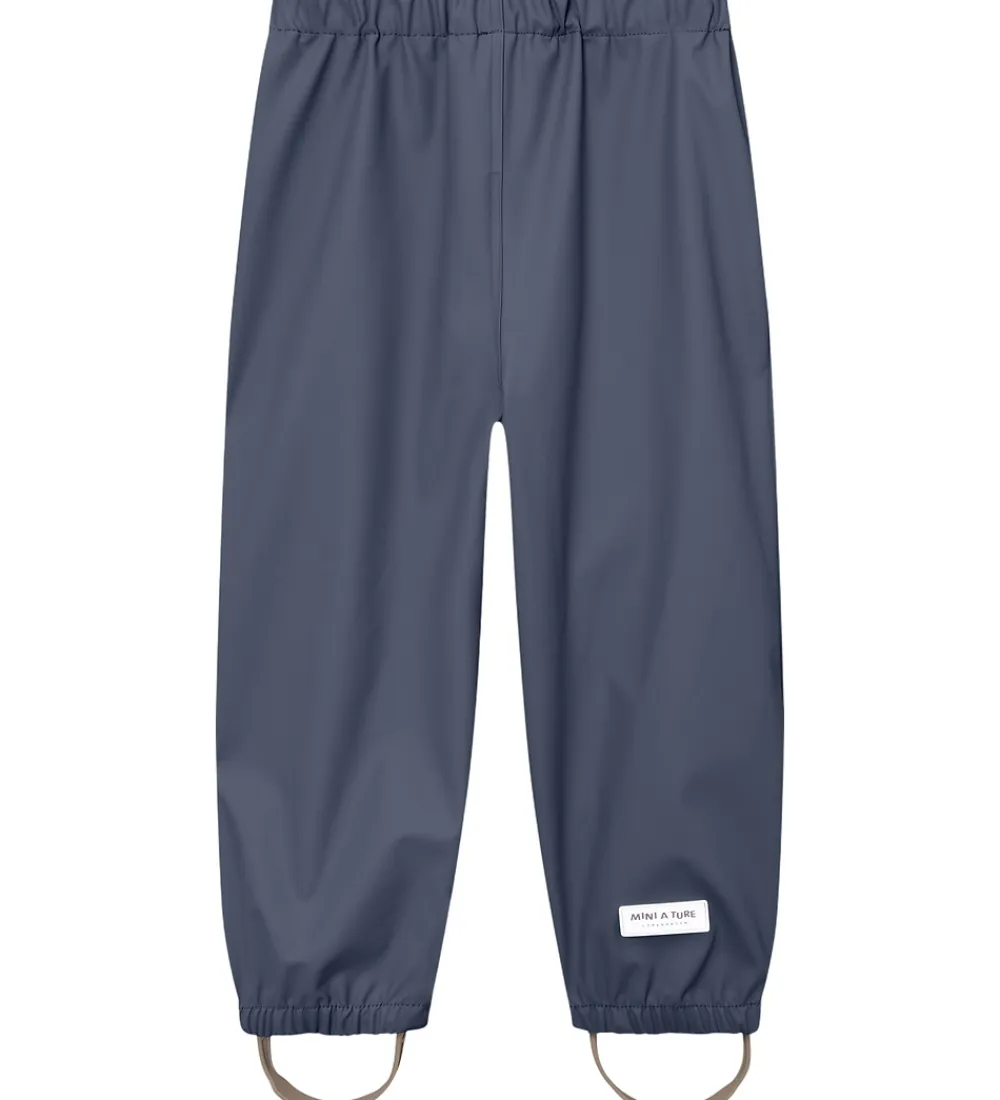 Regnbukserne har en elastikkanter, og i livet kan de kusteres meden elastik. Buksebenene har aftagelige, justerbare gummistropper til at sætte under støvlerne.
