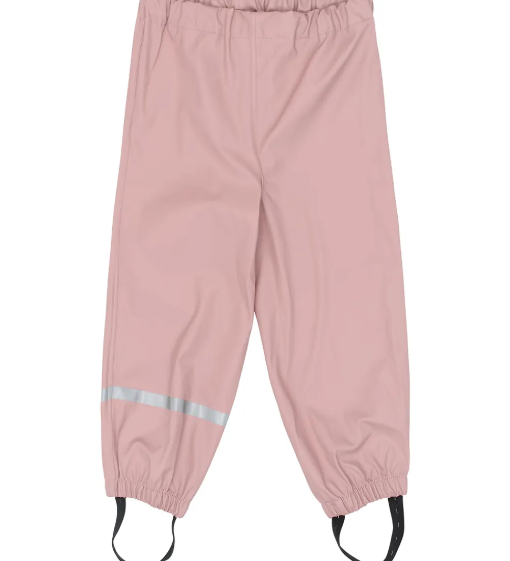 Regnbukserne har en indvendigt justerbar elastikkant i livet og elastikkanter om anklerne samt justerbare elastikstropper, som kan sættes under gummistøvlerne.