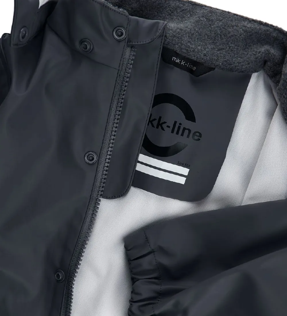Mikk-Line regnjakken har en aftagelig hætte, der sidder fast med trykknapper. Hætten har en elastikkant i begge sider af ansigtsåbningen, så den sidder tæt til, og i halskraven er der foret med blødt, gråt fleece. Der er elastikkanter ved håndleddene, og i bunden er der elastikkanter i siderne. Regnjakken åbnes fortil ved hjælp af en lynlås med udvendig vindstolpe, som lukkes til med trykknapper.