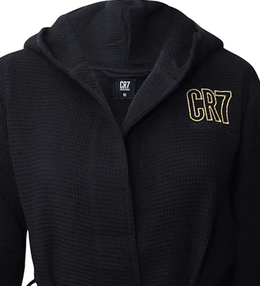 Flot Ronaldo badekåbe i ensfarvet sort bomuld med vaffelstruktur, og fortil i venstre side er står der “CR7” broderet i guld.