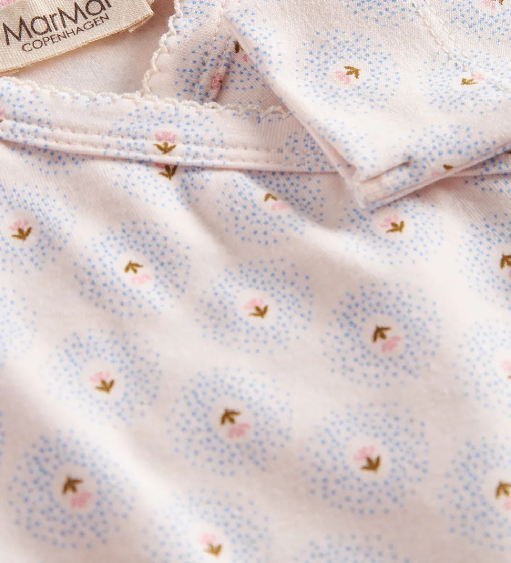 Elegant MarMar slå-om body i cremehvid med lange ærmer og et smukt alloverprint af små blomster og prikker i lyseblå og rosa.