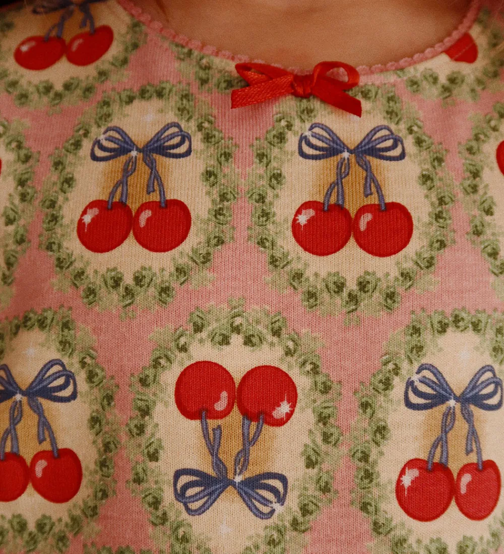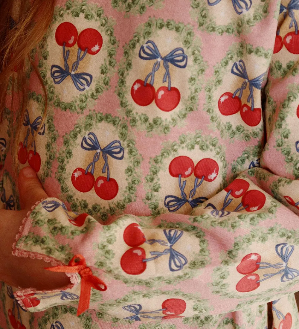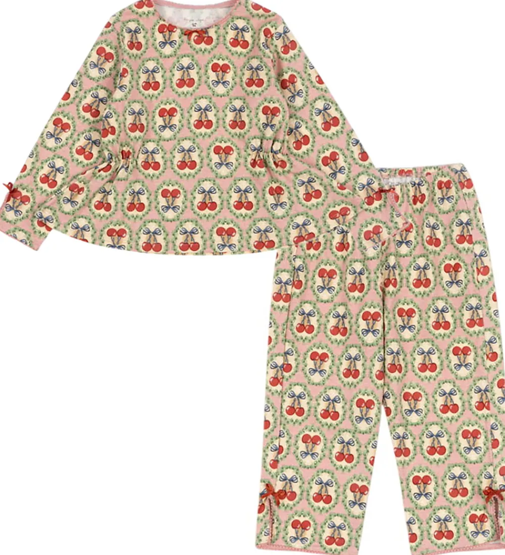 Charmerende sæt fra Konges Sløjd bestående af en bluse og er par bukser. Sættet er i rosa med et alloverprint af kirsebær og blomster i grønne, røde og blå nuancer.
